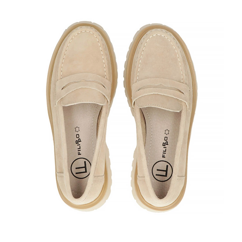 Znana i lubiana marka Filippo przedstawia najnowszą kolekcję wiosenno-letnią. Nowy model półbutów wykonany został wysokiej jakości skóry naturalnej nubukowej w pięknym beżowym kolorze. Wnętrze wyściełano również skórą naturalną. Obuwie wsuwane, które umożliwi nam szybkie zakładanie oraz zdejmowanie. Odporna na ścieranie podeszwa została wykonana z trwałego tworzywa sztucznego. Mokasyny idealnie sprawdzą się w wielu damskich stylizacjach.