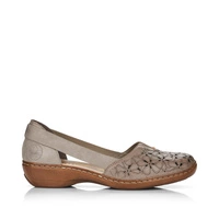 Znana oraz lubiana Niemiecka marka Rieker przedstawia nam półbuty z najnowszej kolekcji. Model w odcieniu beżowym wykonany został z wysokiej jakości skóry naturalnej licowej z połączeniem skóry ekologicznej nubukowej. Wnętrze wyściełano przyjemną dla stopy skórą naturalną oraz ekologiczną. Modne ażurowe wycięcia nadają charakterystycznego wyglądu. Fason wsuwany, co ułatwi nam szybkie zakładanie oraz zdejmowanie. Podeszwę wykonano z wysokogatunkowego tworzywa sztucznego odpornego na ścieranie. Modne półbuty świetnie dopasujemy do stylizacji z sukienkami jak i jeansami.