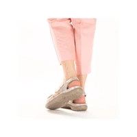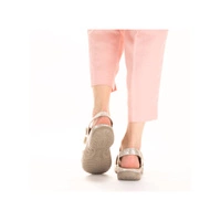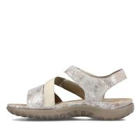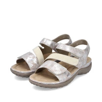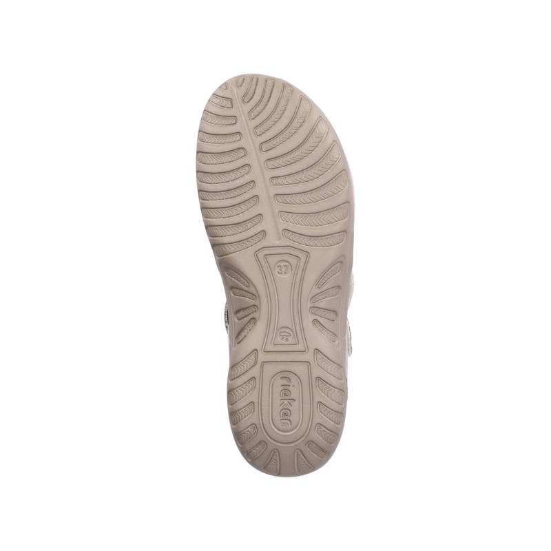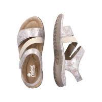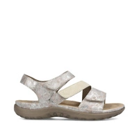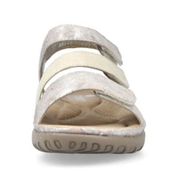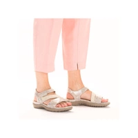 Najnowszy model sandałów damskich przedstawia dla nas lubiana przez klientów marka Rieker z najnowszej kolekcji wiosenno-letniej. Cholewka całościowo wykonana została z najwyższej jakości skóry ekologicznej nubukowej w kolorze beżowo-srebrnym. Wnętrze wyściełane zostało przyjemną dla skóry stóp skórą ekologiczną, natomiast do wykonania wkładki wykorzystano miekką tkaninę. Fason zapinany na rzep, co pozwoli na szybkie i bezproblemowe zakładanie. Podeszwa wykonana z wysokogatunkowego tworzywa sztucznego. Model osadzony został na niskiej platformie.