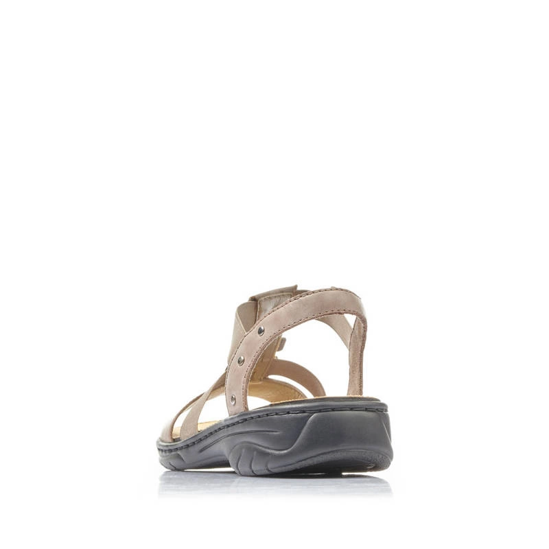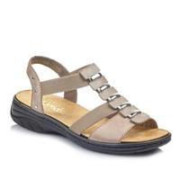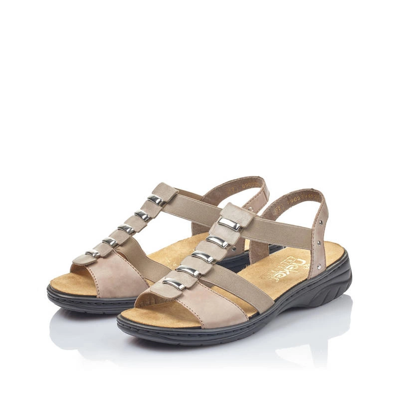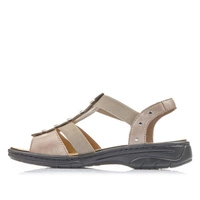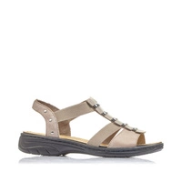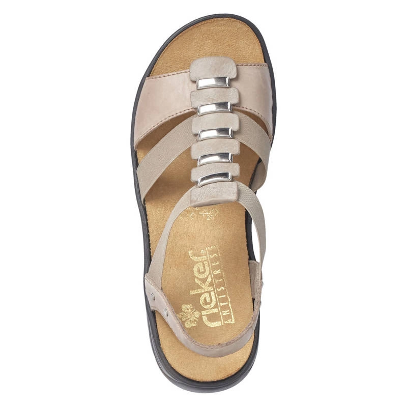Ceniona oraz znana niemiecka marka Rieker prezentuje sandały damskie z najnowszej kolekcji wiosenno-letniej. Cholewka obuwia została wykonana z wysokiej jakości skóry ekologicznej licowej w beżowym odcieniu. Wnętrze buta zostało wyściełane delikatną dla stóp wkładką, która zapewni wygodę oraz komfort podczas chodzenia. Sandały posiadają elastyczne gumki, co umożliwia ich szybkie zakładanie oraz wygodę podczas użytkowania. Całość osadzona na płaskim obcasie. Cholewka obuwia została przyozdobiona dodatkami w kolorze srebrnym, które dodają obuwiu elegancji. Model ten sprawdzi się do wielu stylizacji i przypadnie do gustu wielu Paniom.