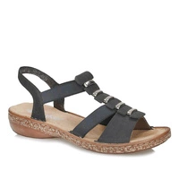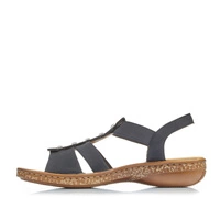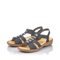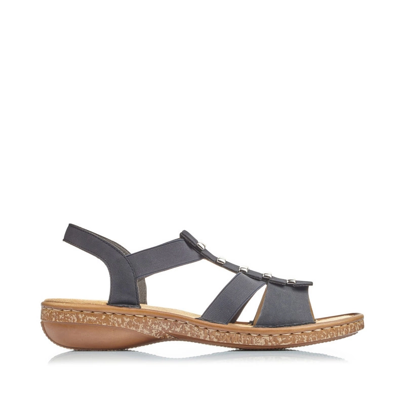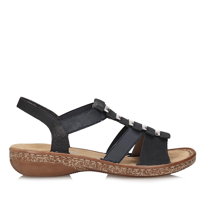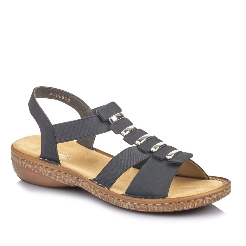 Ceniona oraz znana Niemiecka marka Rieker prezentuje sandały damskie z najnowszej kolekcji. Cholewka obuwia została wykonana z wysokiej jakości skóry ekologicznej licowej w pięknym granatowym kolorze. Wnętrze buta zostało wyściełane delikatną dla stóp wkładką, która zapewni wygodę oraz komfort podczas chodzenia. Sandały posiadają elastyczne gumki, co umożliwia ich szybkie zakładanie oraz wygodę podczas użytkowania. Całość osadzona na płaskim obcasie. Cholewka obuwia została przyozdobiona dodatkami w kolorze srebrnym, które dodają obuwiu elegancji. Model ten sprawdzi się do wielu stylizacji i przypadnie do gustu wielu Paniom.