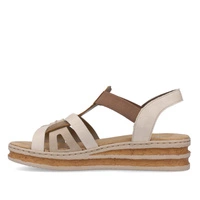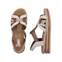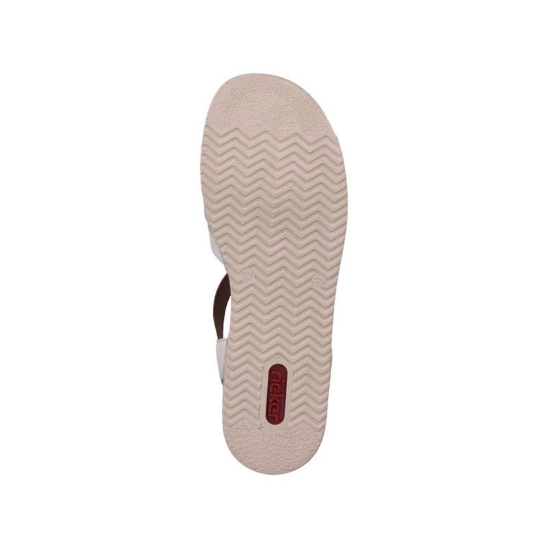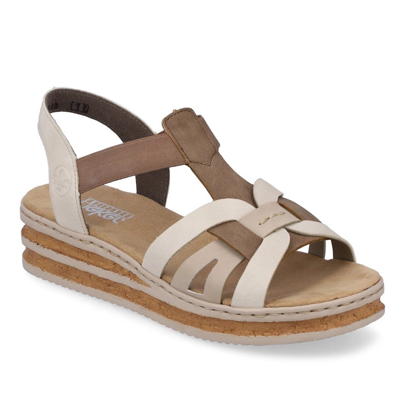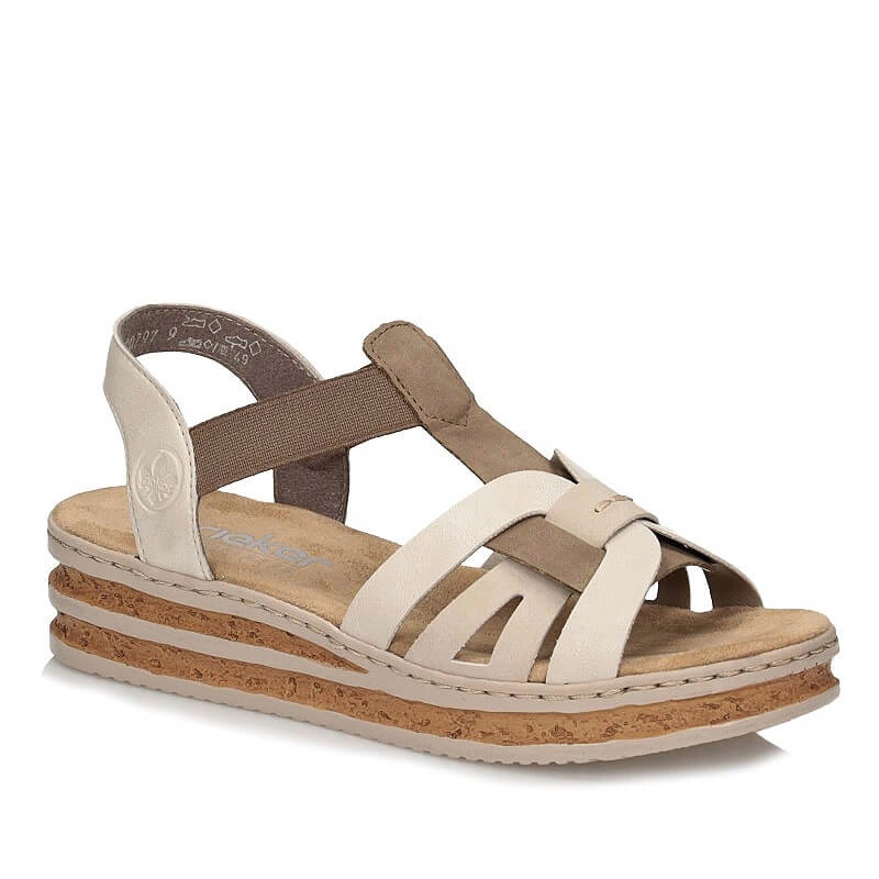 Niemiecka marka Rieker przedstawia nam sandałki na nadchodzący sezon z najnowszej kolekcji. Cholewka prezentowanego modelu została wykonana z najwyższej jakości skóry ekologicznej w odcieniu beżowym z brązowymi elementami. Wnętrze wyściełano przyjemną dla stóp wkładką wykonaną z tkaniny, która zapewni nam wygodę podczas całodziennego użytkowania obuwia. Zastosowane gumki, które pozwolą nam na szybkie i łatwe zakładanie oraz zdejmowanie obuwia. Nosek zaokrąglony lekko uniesiony ku górze co pozwoli nam na swobodne rozłożenie palców. Podeszwa wykonana z tworzywa sztucznego odpornego na ścieranie. Model sprawdzi się do wielu kobiecych wiosenno-letnich stylizacji.