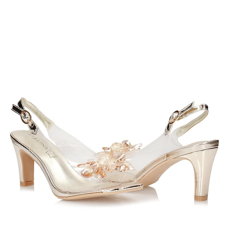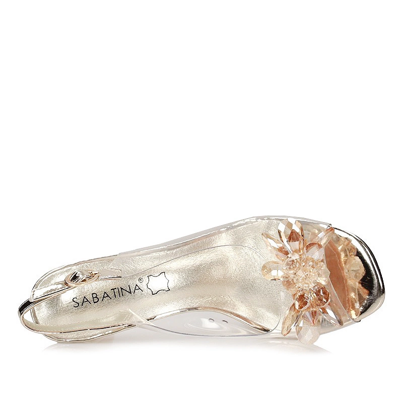 Marka Sabatina przedstawia nam sandały damskie z najnowszej kolekcji wiosenno-letniej. Model został wykonany z wysokiej jakości skóry naturalnej w odcieniu złotym. Wkładka delikatna wykonana z skóry naturalnej zapewni nam odpowiedni komfort podczas użytkowania. Podeszwa wykonana z wysokogatunkowego tworzywa sztucznego z właściwościami odpornymi na ścieranie. Ozdobne kwiaty z cyrkonii, umieszczone na cholewce dodają obuwiu oryginalnego wyglądu. Nosek odkryty, oraz lekko uniesiony ku górze pozwoli na swobodne rozłożenie palców. Model zapinany na sprzączkę która pozwoli szybkie zakładanie obuwia. Całość oparta jest na stabilnym złotym obcasie o wysokości 8 cm. Ciekawy model sandałków uzupełni wiele kobiecych stylizacji. Jest to model sandałów w stylu marki Sca'viola.