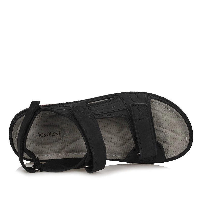 Najnowszy model sandałów męskich przedstawia nam lubiana przez klientów marka T.Sokolski na nadchodzący sezon z najnowszej kolekcji wiosenno-letniej. Cholewka prezentowanego modelu wykonana z najwyższej jakości skóry naturalnej nubukowej w klasycznym czarnym kolorze. Wnętrze wyściełane przyjemną oraz delikatną dla stóp wkładką z wysokogatunkowego tworzywa, zapewni ona komfort podczas całodziennego użytkowania. Fason zapinany na rzep, co pozwoli nam szybkie i bezproblemowe zakładanie obuwia. Nosek odkryty, lekko uniesiony ku górze pozwoli na swobodne rozłożenie palców. Podeszwa wykonana z wysokogatunkowego tworzywa sztucznego odpornego na ścieranie. Model osadzony na niskiej platformie. Wykonany z myślą o mężczyznach ceniących sobie zarówno wygodę jak i styl.