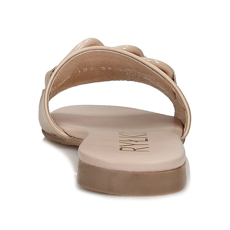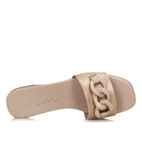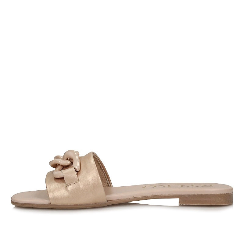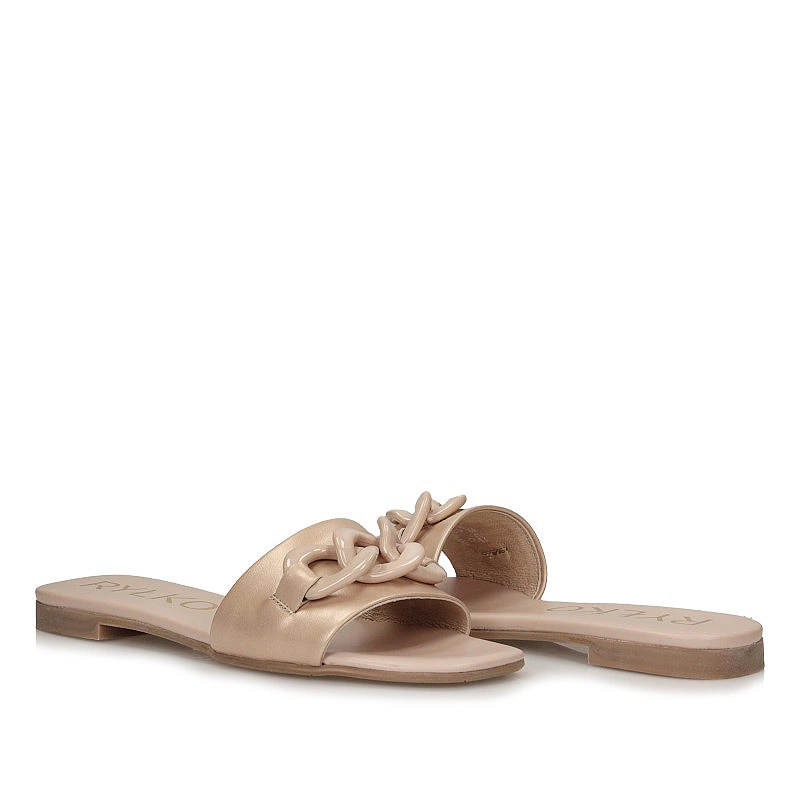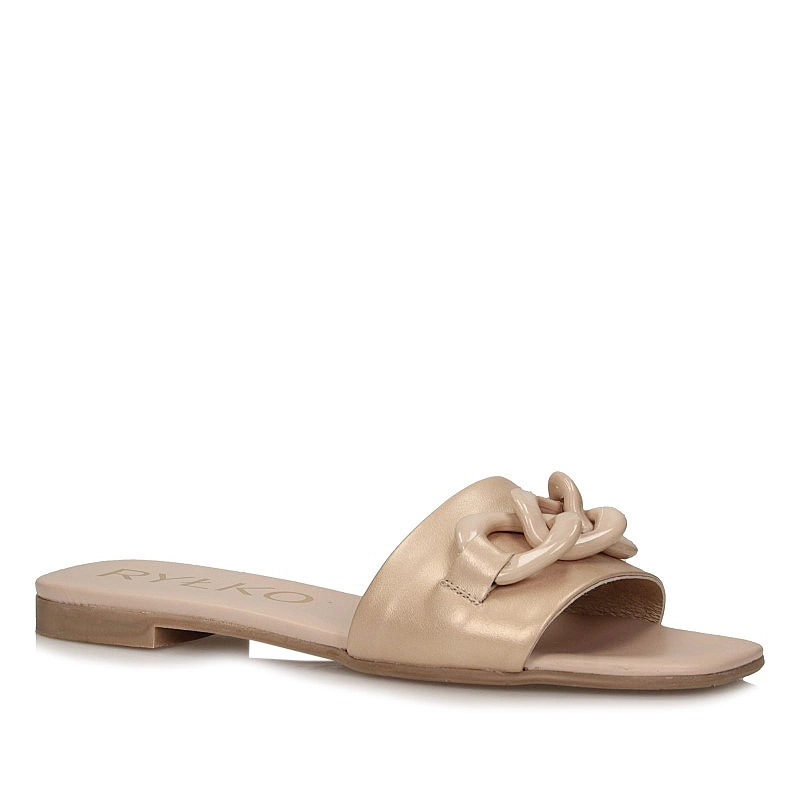 Znana nam marka Ryłko przedstawia nam klapki na nadchodzący sezon z najnowszej kolekcji wiosenno-letniej. Cholewka została wykonana z najwyższej jakości skóry naturalnej w złotym kolorze. Wnętrze wyściełano przyjemną oraz delikatną dla stóp wkładką ze skóry naturalnej która zapewni komfort oraz wygodę podczas całodziennego użytkowania obuwia. Nosek odkryty, lekko uniesiony ku górze pozwoli na swobodne rozłożenie palców. Model przyozdobiony łańcuchem dzięki czemu dodaje obuwiu oryginalnego wyglądu. Podeszwa wykonana z wysokogatunkowego tworzywa sztucznego z właściwościami antypoślizgowymi. Klapki dzięki niespotykanemu wyglądowi z pewnością przypadną do gustu niejednej kobiecie.