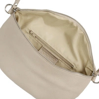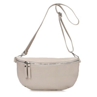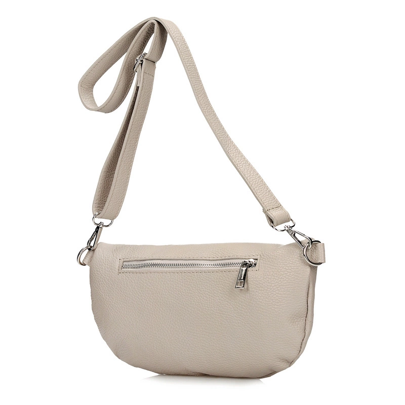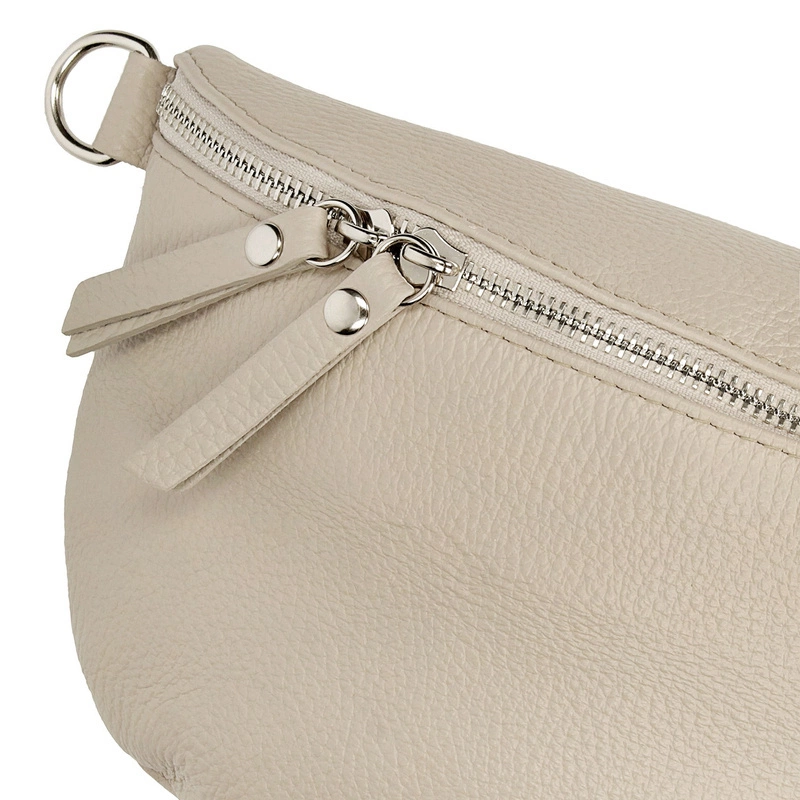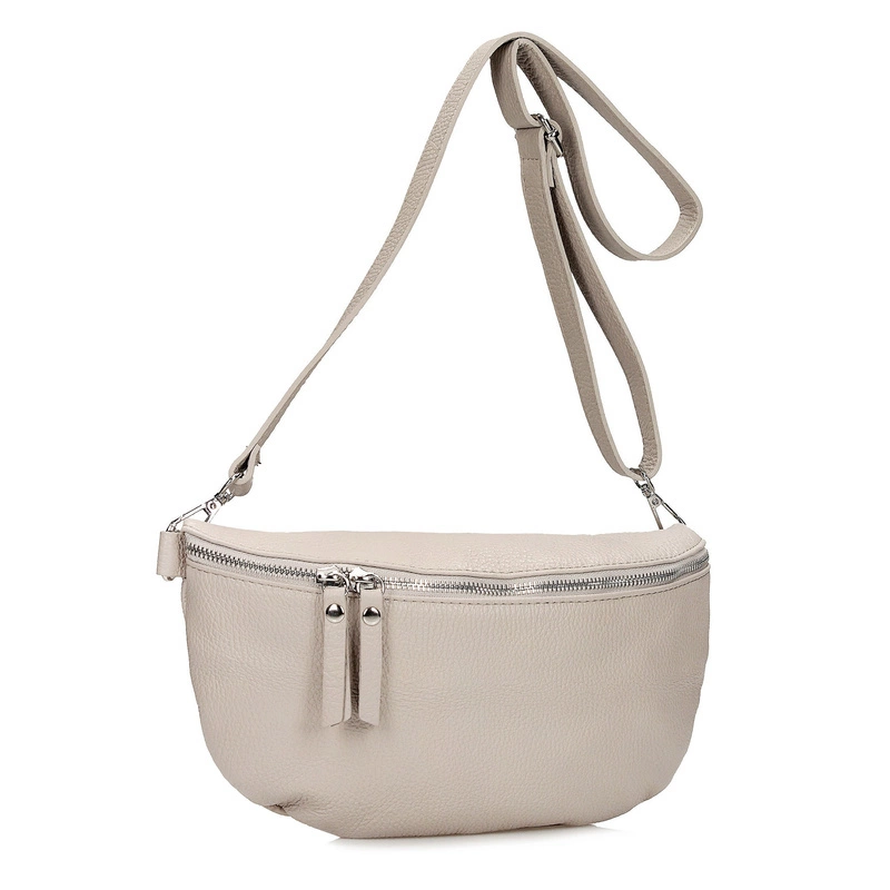 Włoska marka Toscanio stworzyła praktyczną nerkę ze skóry naturalnej w beżowym odcieniu. Model zapinany na zamek, wyposażona w dodatkowe kieszonki, pozwalające na przechowanie kobiecych drobiazgów. Posiada możliwość regulacji.