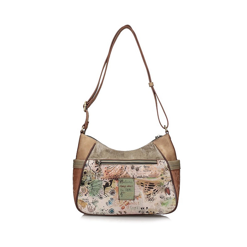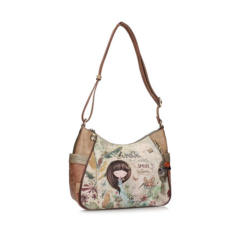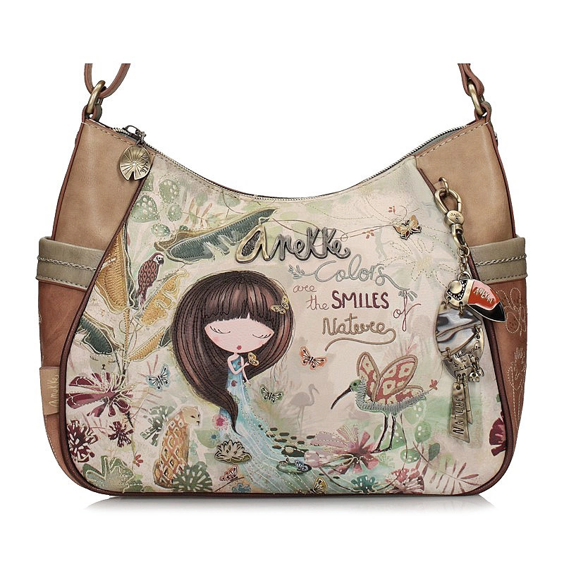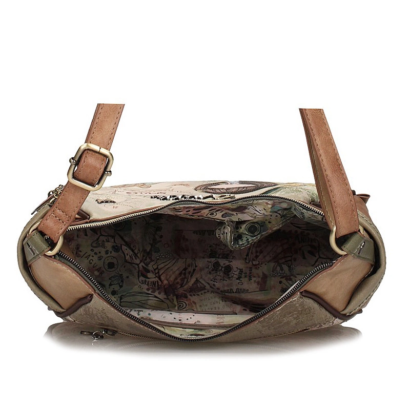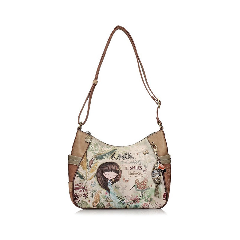 Znana hiszpańska marka Anekke prezentuje nam nowy model torebki z najnowszej wiosenno-letniej kolekcji. Model całościowo wykonany został z najwyższej jakości skóry ekologicznej w odcieniach brązu, beżu oraz zieleni. Torebka jednokomorowa zapinana na zamek, wewnątrz mieści się jedna kieszonka na zamek oraz mały organizer , natomiast zewnątrz producent umieścił pojemną kieszonkę również zapinaną na zamek. Model został ozdobiony dziewczynką, która podróżuje i zwiedza różne kraję na całym świecie. Torebkę można nosić na ramieniu za pomocą regulowanego paska, dołączonego od producenta.
