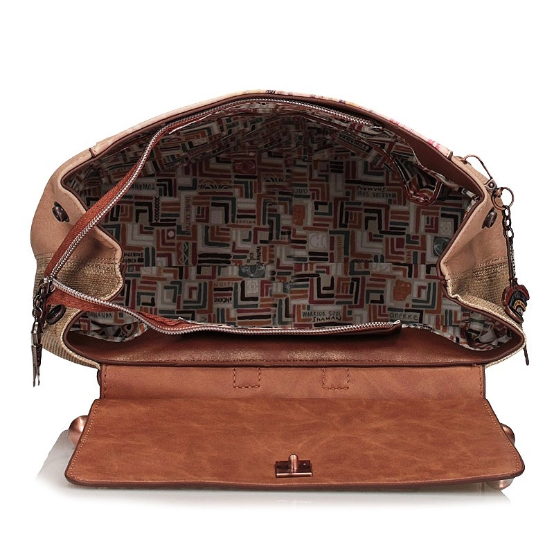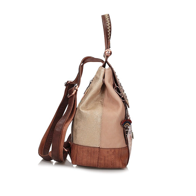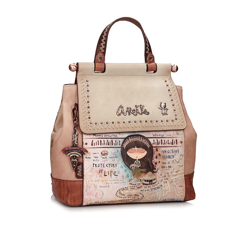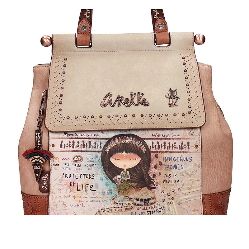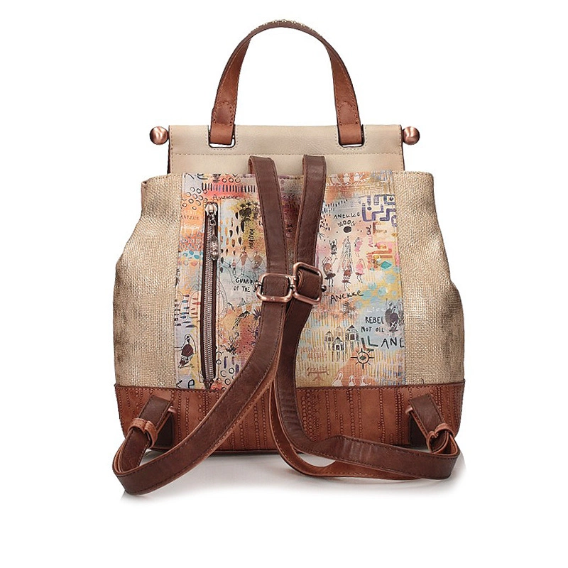 Ciekawa kolorystyka w odcieniach beżu i brązu z kolorowym nadrukiem. Wykonany w całości z najwyższej jakości skóry ekologicznej licowej. Zapinany na zamek. Wewnątrz starannie obszyty wysokiej jakości materiałem. Wnętrze z jedną dużą komorą. Ponadto w komorze kieszonki na drobiazgi i telefon, w tym jedna zapinana na zamek. Dodatkowe jedna zapinana na zamek kieszonka na zewnątrz. Paski regulowane i wygodna rączka. Plecak jest bardzo pakowny. Jak wszystkie produkty marki Anekke uszyty z dbałością o każdy szczegół.