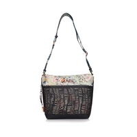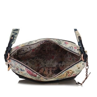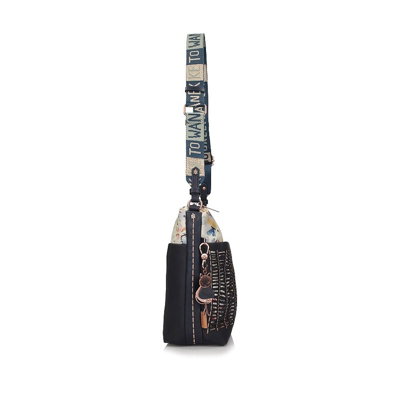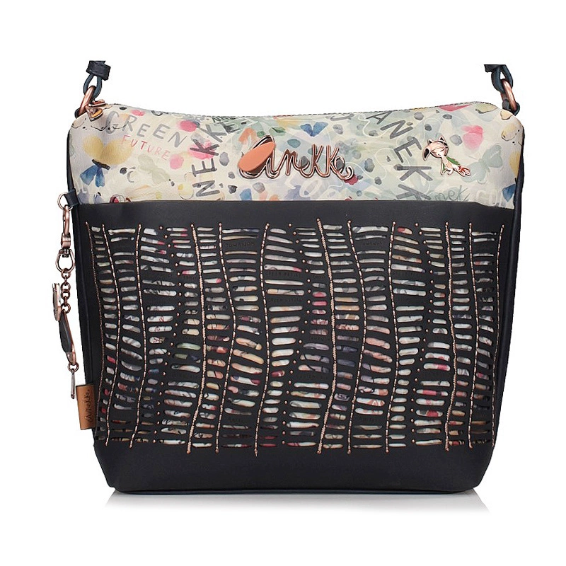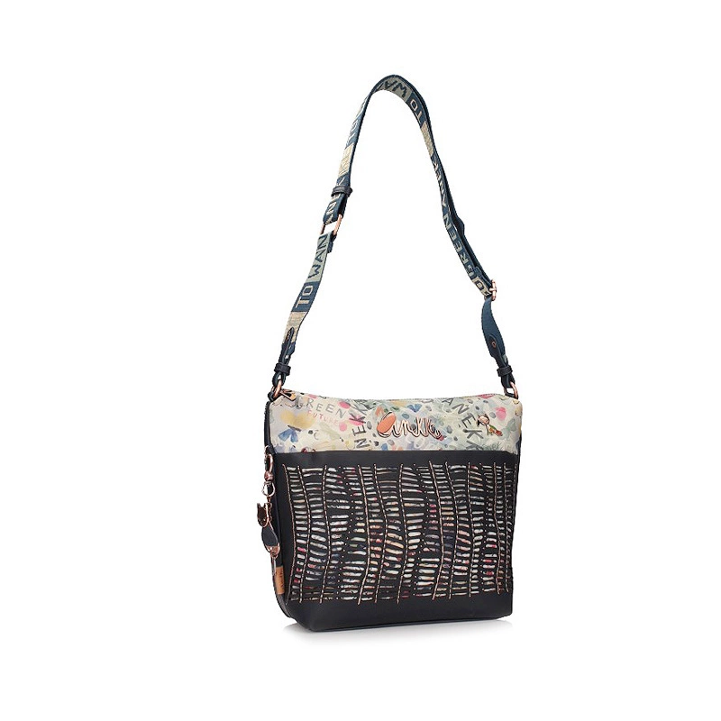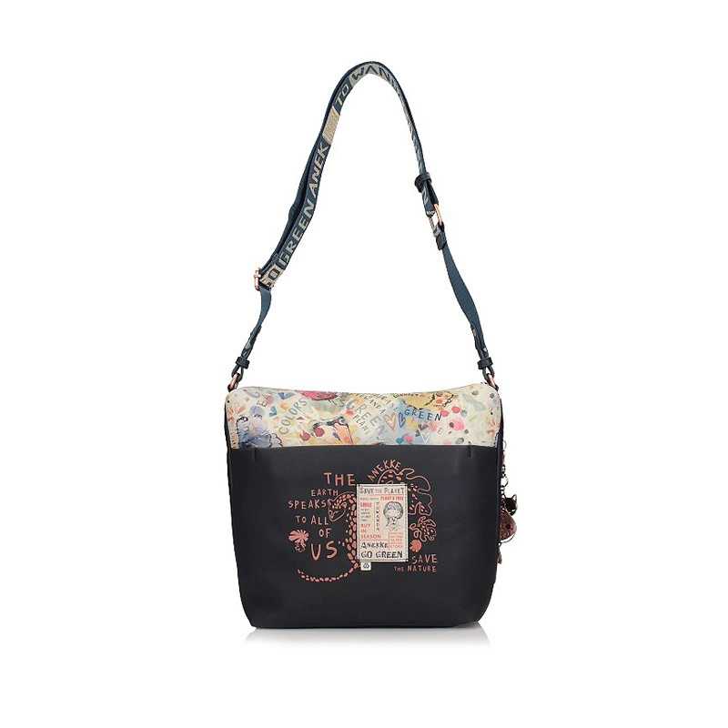 Nowa kolekcja marki Anekke. Jest to model w kolorze granatowym, który łączy w swoim designie oryginalny wielobarwny nadruk inspirowany elementami natury i motyli. Ma drukowane części połączone z wycinaną tkaniną i gładką tkaniną, zmieszaną z inspirującymi drukowanymi frazami i innymi detalami. Jest to  duża torba z przednimi i tylnymi kieszeniami. Materiał ma miękką sztywność, która utrzymuje kształt torby, tworząc elegancki i wygodny element. Rączka to regulowany pasek na ramię o różnej długości, idealny do dopasowania do preferowanej wysokości. Wnętrze wyłożone jest oryginalną tkaniną z nadrukiem motywów z kolekcji i posiada kieszenie.