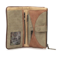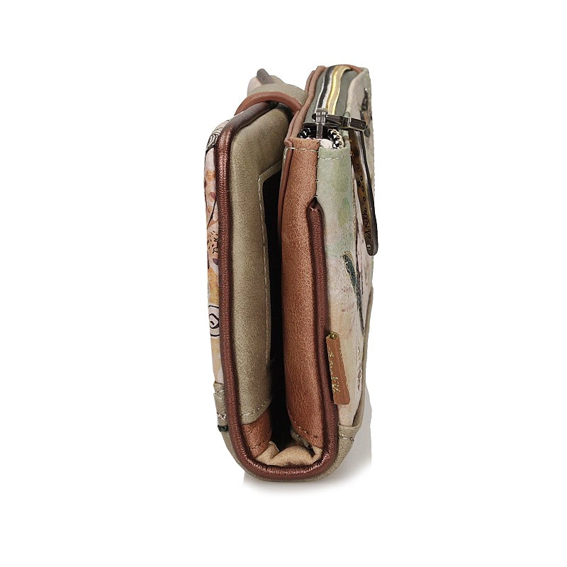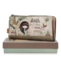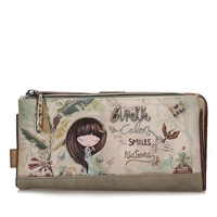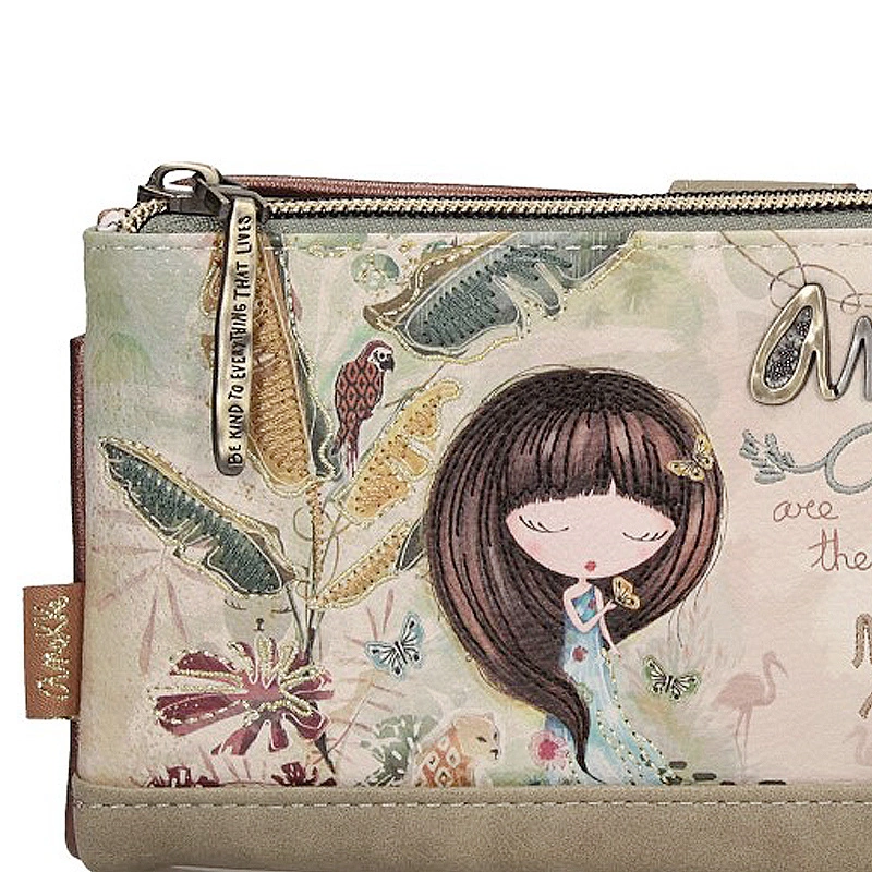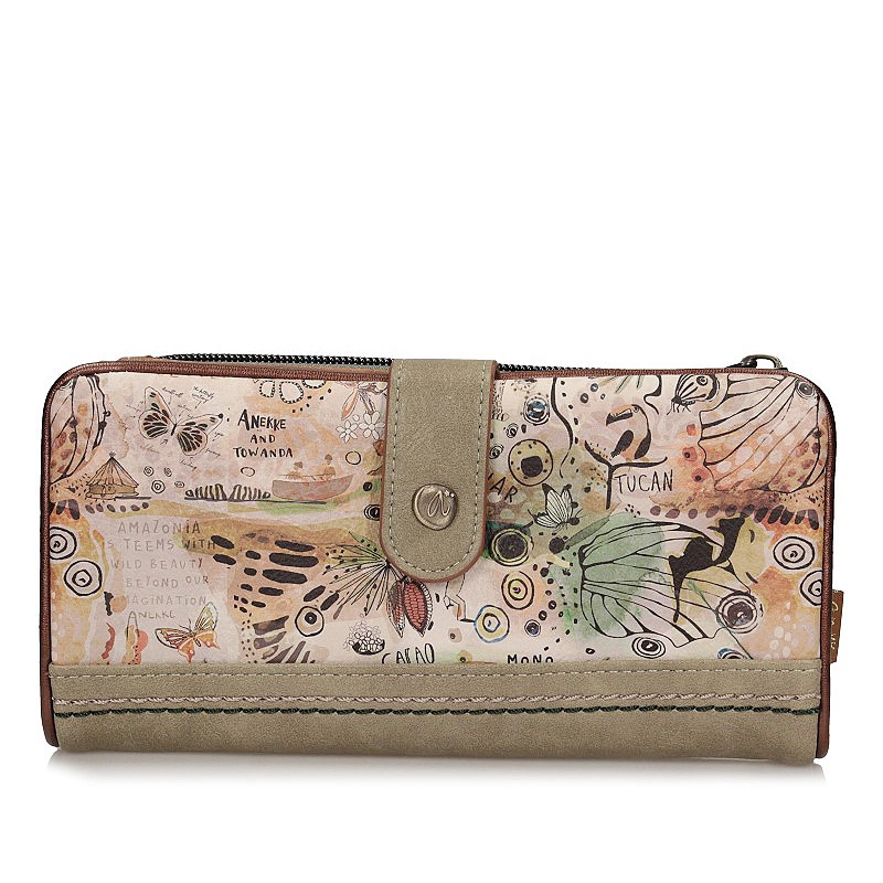 Portfel ma duży rozmiar. Materiał, z którego jest wykonana jest elastyczny. Model ten posiada zabezpieczenie RFID: innowacyjny system ochrony, który chroni nasze karty przed nieautoryzowanymi płatnościami, kradzieżą informacji i ingerencją. Jeśli chodzi o projekt, przód łączy nadruk inspirowany podróżą Anekke przez amazoński las deszczowy. Niebieska sukienka łączy się z Amazonką, reprezentując jej związek z lądem poprzez wodę. Otaczają ją setki naturalnych elementów i zwierząt, nadruk z efektem akwareli z licznymi detalami, subtelnymi metalicznymi detalami, haftami... Posiada dwie główne przegrody: tylną, w której znajdziesz duży portfel i miejsce na banknoty lub dokumenty. Górna część zapinana jest na suwak, a wewnątrz można przechowywać monety. Całe wnętrze wyłożone.
