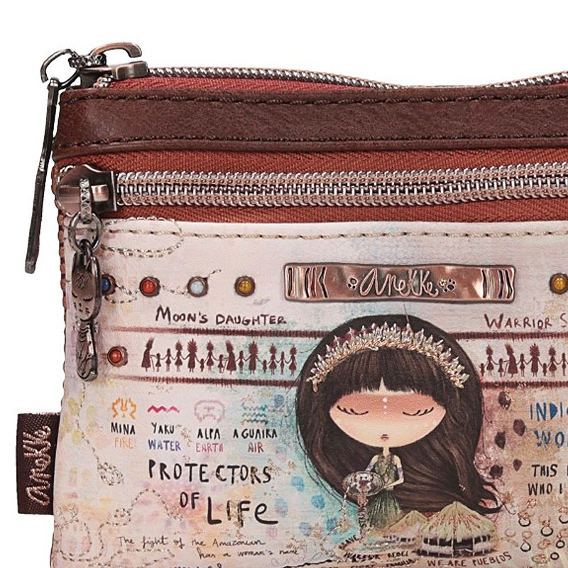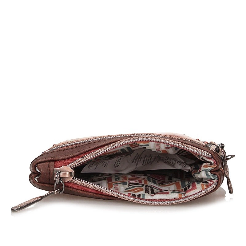 Hiszpańska marka Anekke przedstawia nam portfel. Portfel został wykonany ze skóry ekologicznej licowej. Wnętrze produkty wykonane z drukowanej tkaniny. Produkt zamykany na zamek, posiadający dwie kieszonki. Portfel jest wielokolorowy z odcieniem brązu z ciekawymi dodatkami i napisami.