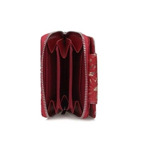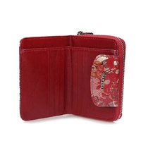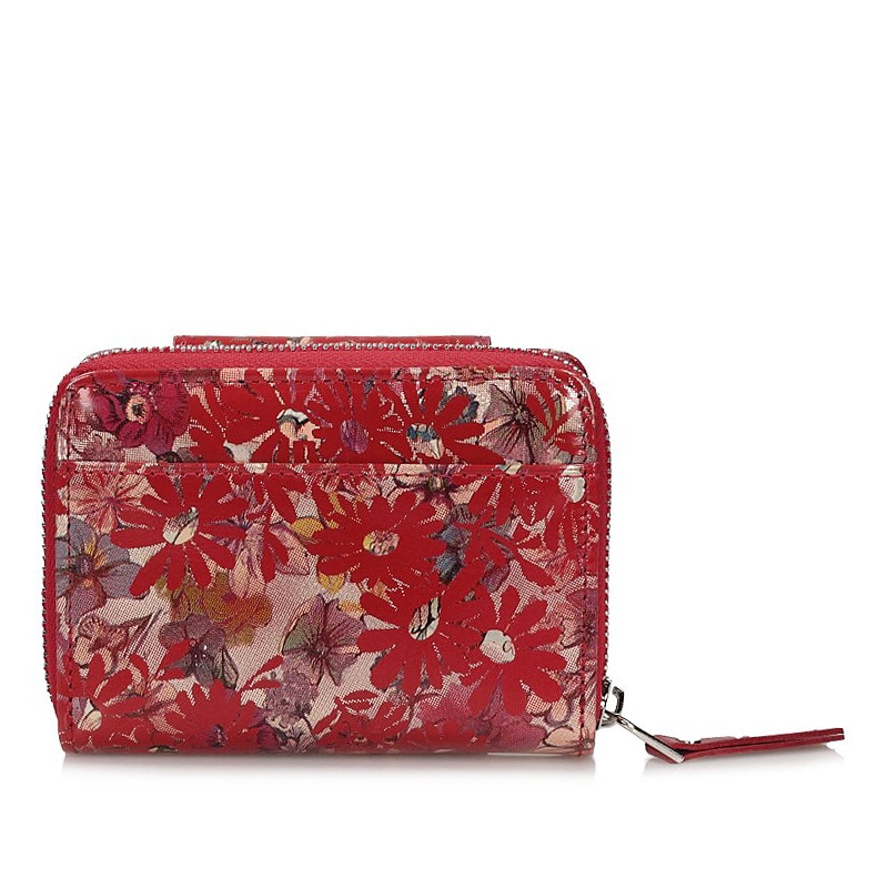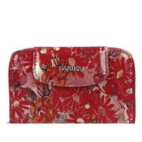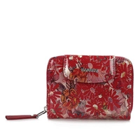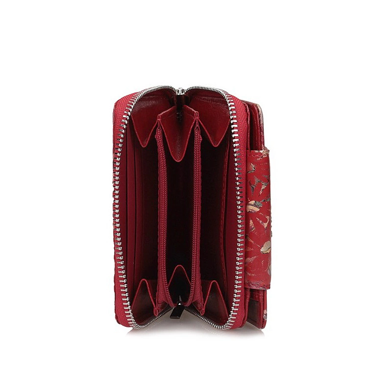 Marka Baju Baj prezentuje najnowszy model portfela damskiego. W całości został on wykonany z naturalnej skóry w czerwonym odcieniu. Model ten zapinany na zatrzask. W środku znajdziemy miejsce na karty oraz na banknoty. Kieszeń na bilon zapinana na zamek. W środku tej kieszeni również znajdziemy miejsce na karty. Całość przyozdobiona oryginalnym kwiatowym motywem.