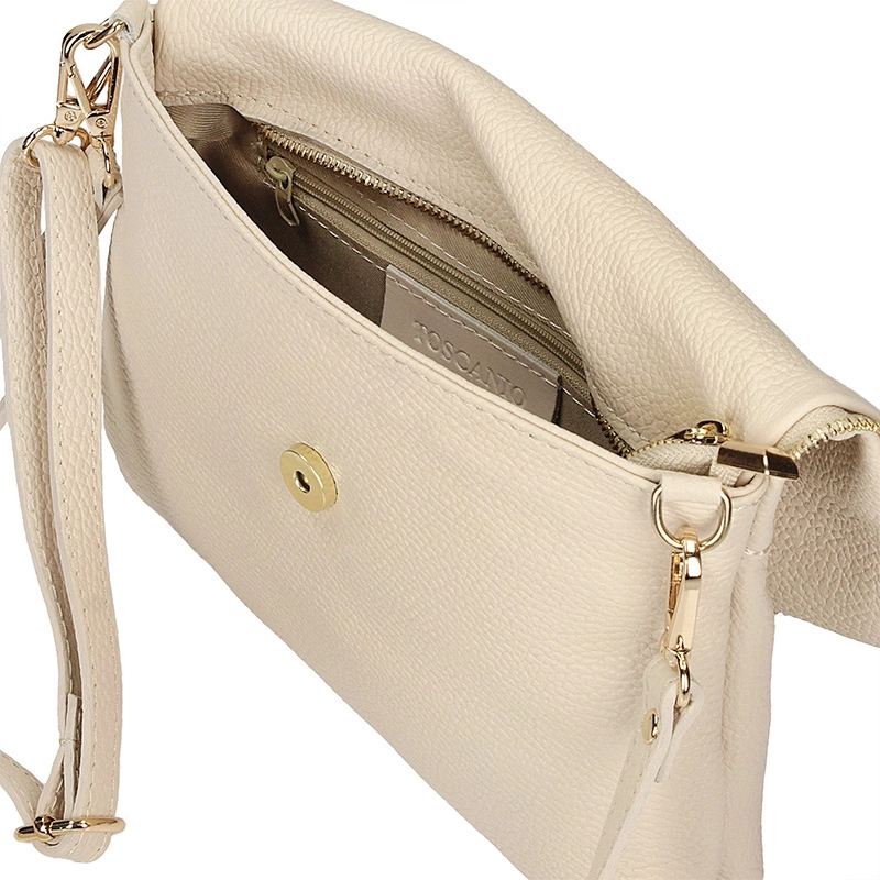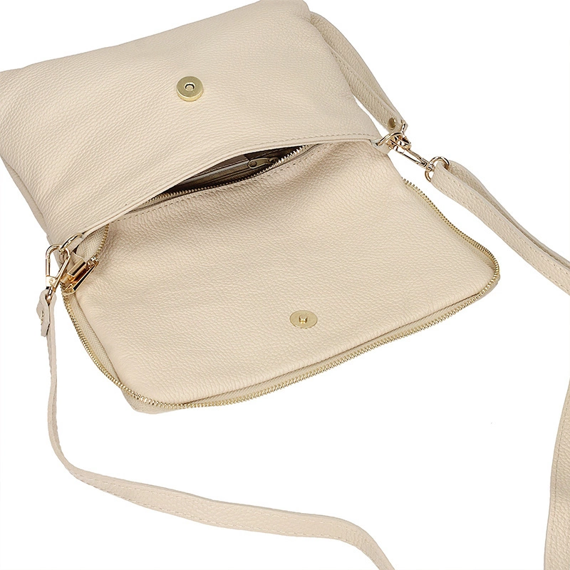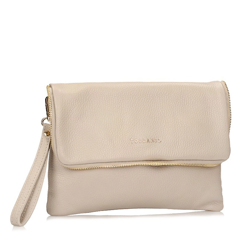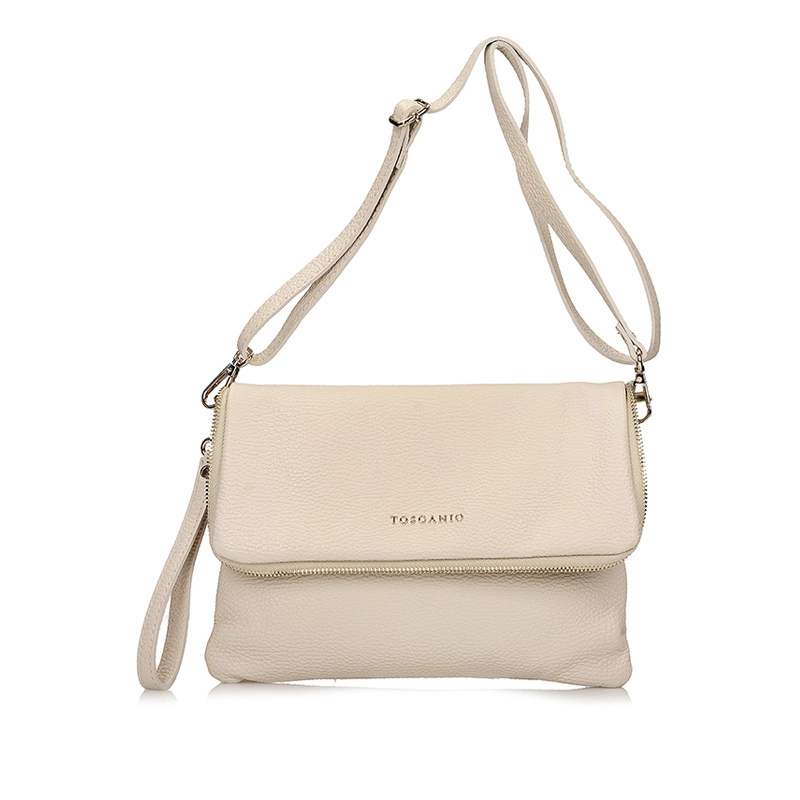 Znana oraz lubiana włoska marka Toscanio prezentuje nam model listonoszki z najnowszej kolekcji. Torebka wykonana została z najwyższej jakości skóry naturalnej licowej w beżowym kolorze. Na froncie znajduje się metalowe logo marki. Wewnątrz znajdują się dwie otwarte kieszonki na kobiece drobiazgi oraz jedna zapinana na zamek. Torebkę wyposażono w długi, regulowany pasek, który umożliwia dopasowanie torebki do indywidualnych potrzeb. Model ten świetnie sprawdzi się w codziennych stylizacjach.