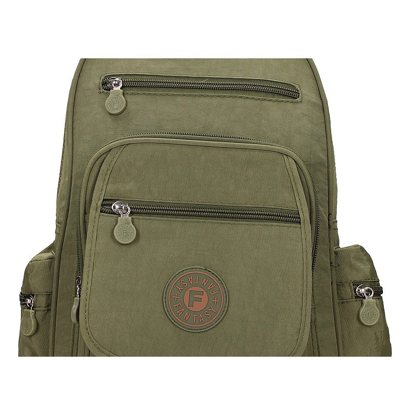 Plecak marki Fantasy to idealny model na wycieczki czy długie spacery. który chętnie wybierany jest przez Panie. Wykonany z materiału tekstylnego w kolorze zielonym. Jednokomorowy, z wewnętrzną kieszonką zapinaną na zamek oraz kieszonką na telefon. Model zapinany na zamek. Dodatkowe kieszonki umieszczone z przodu oraz z tyłu pomieszczą dokumenty czy klucze. Możliwość noszenia w ręku za pomocą solidnych raczek lub na ramieniu czy plecach za pomocą szelek.