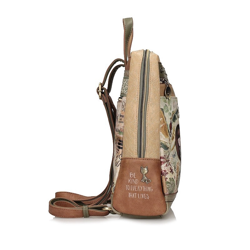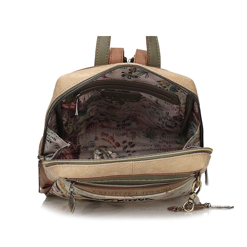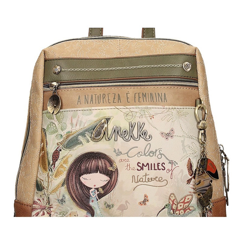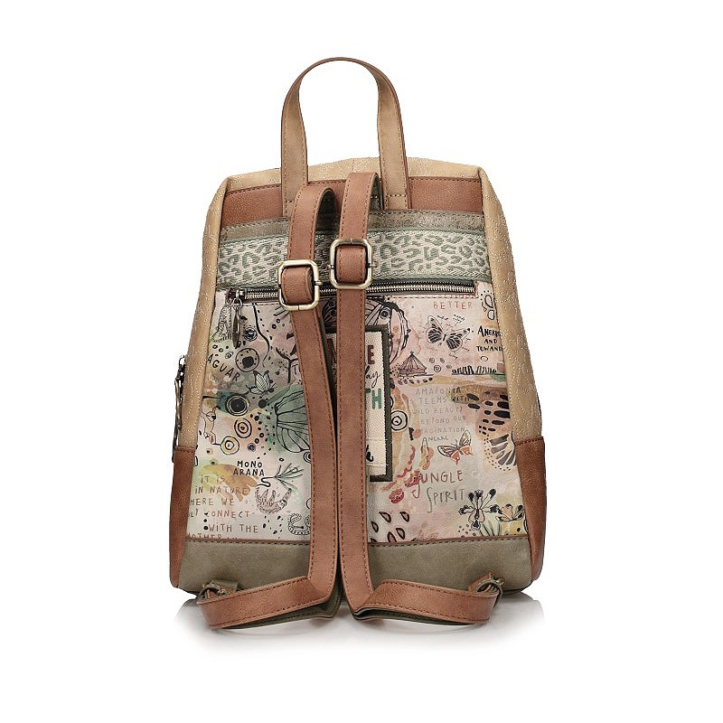 Marka Anekke przedstawia nam plecak z najnowszej kolekcji. Ta kolekcja jest inspirowana podróżą Anekke przez amazońskie lasy deszczowe, uważane za płuca planety. Główny nadruk w odcieniach zieleni ,terakoty i ochry przedstawia Anekke odzianą w sukienkę, która łączy z Amazonką symbolizując połączenie z Matką Naturą poprzez wodę. Torebka wykonana została z skóry ekologicznej licowej. Tył łączy nadruk inspirowany zagrożonymi zwierzętami z efektem akwareli i posiada ozdobną naszywkę. Plecak ma dwa regulowane paski o różnej długości oraz uchwyt do trzymania w dłoni. Wnętrze wyłożone oryginalną tkaniną z nadrukiem motywów z kolekcji, posiada kieszonki na kobiece drobiazgi. Model ten idealnie przypadnie do gustu wielu Paniom.