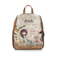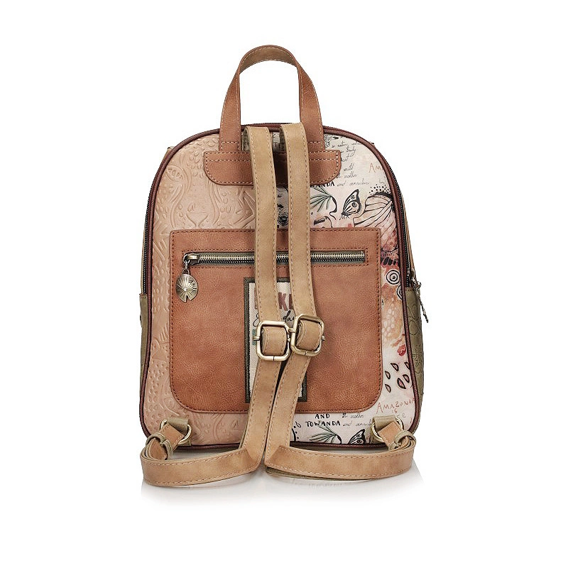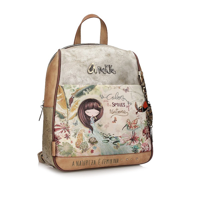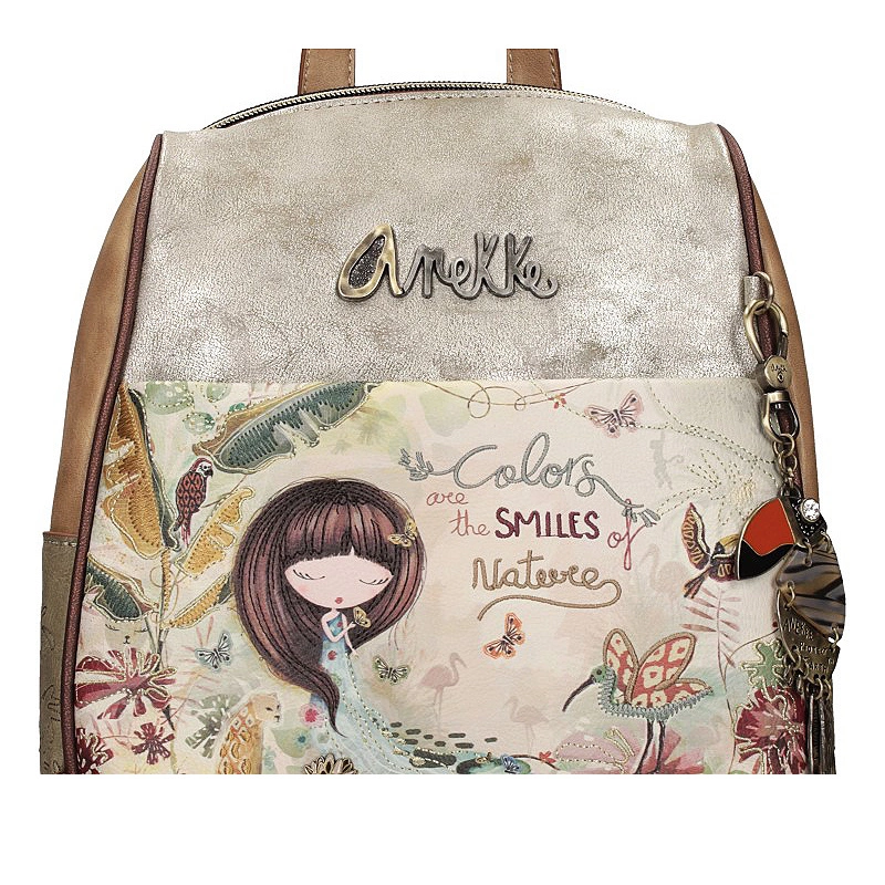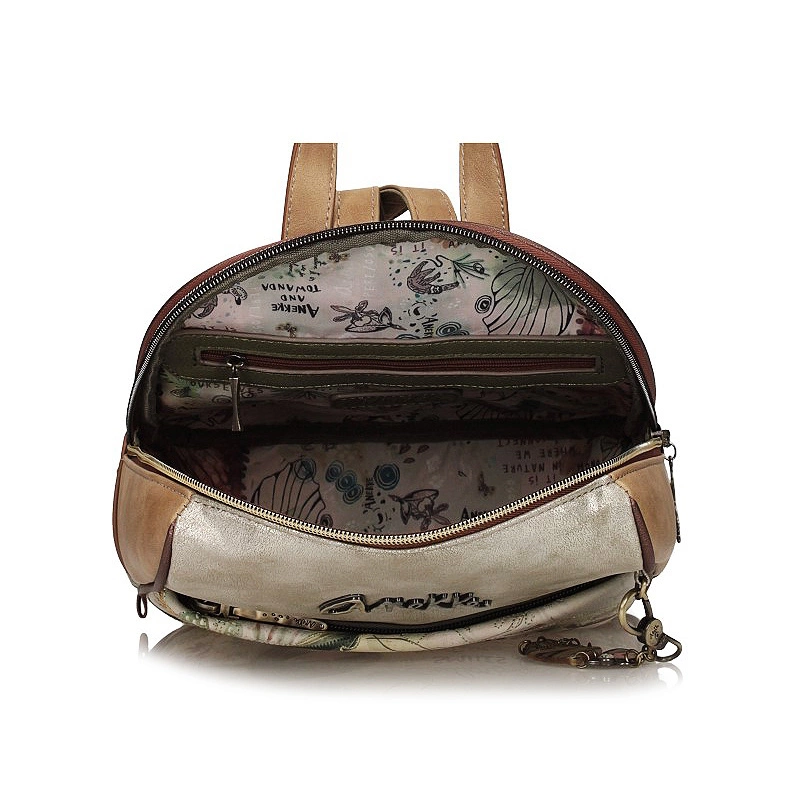 Marka Anekke przedstawia nam plecak z najnowszej kolekcji, która inspirowana jest podróżą Anekke przez lasy deszczowe, uważane za płuca planety. Plecak wykonany został z skóry ekologicznej licowej. Główny nadruk w odcieniach zieleni, terakoty i ochry przedstawia Anekke odzianą w suknię, która łączy się z Amazonką, symbolizując połączenie z Matką Naturą poprzez wodę. Otoczony roślinnością i zwierzętami akwarelowy nadruk ożywa dzięki niezliczonym detalom haftu i metalicznym akcentom. Boki plecaka mają haftowane motywy organiczne. Tył łączy nadruk z gładkim materiałem i ma ozdobną naszywkę. Plecak ma dwa regulowane paski o różnej długości oraz uchwyt do trzymania w dłoni. Wnętrze wyłożone oryginalną tkaniną.
