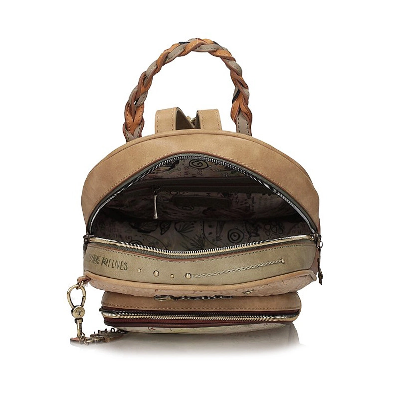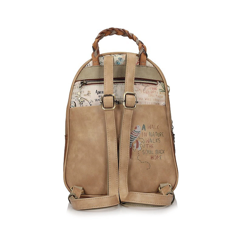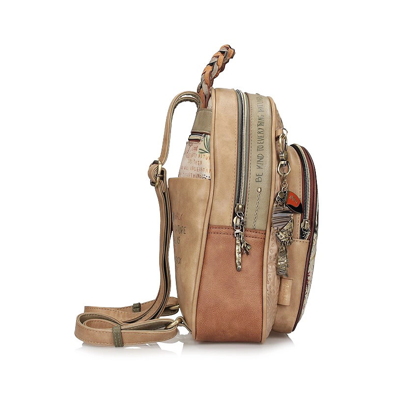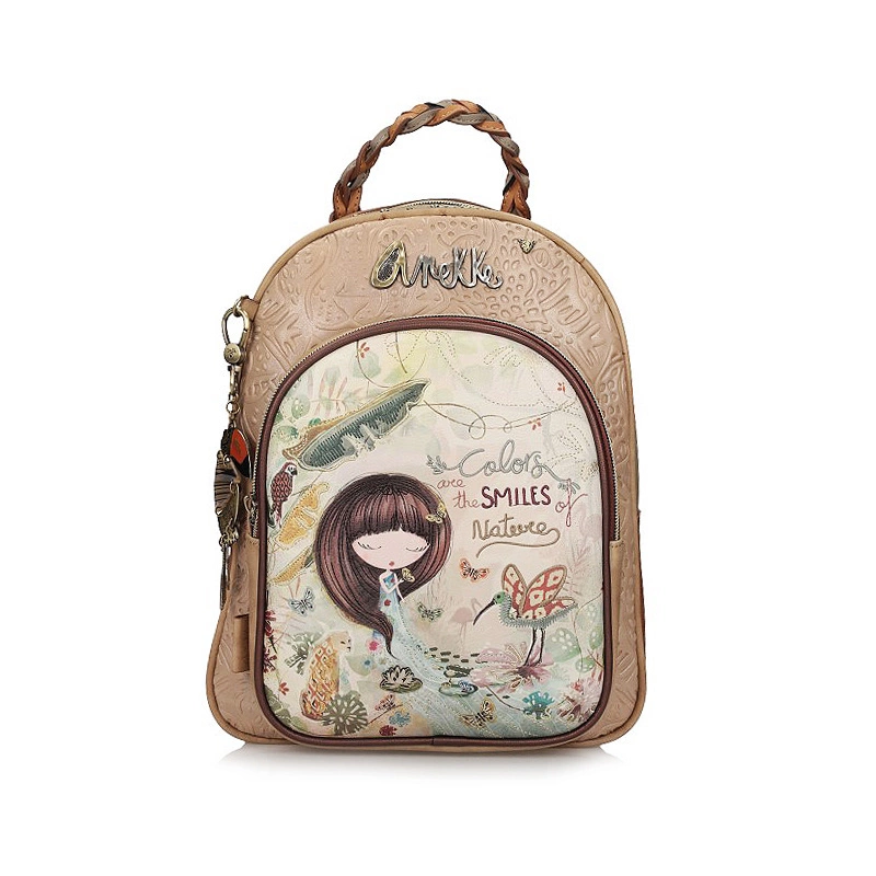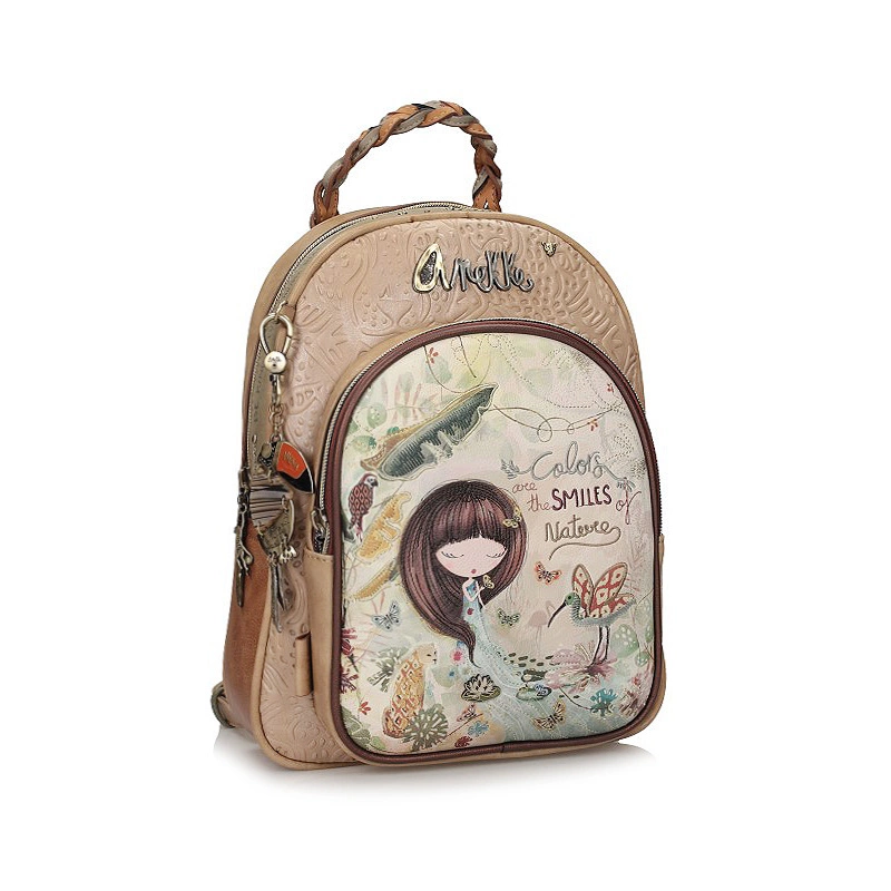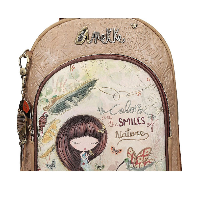 Marka Anekke przedstawia nam plecak damski z najnowszej kolekcji. Ta kolekcja inspirowana jest podróżą Anekke przez deszczowe lasy amazońskie, które uznawane są za płuca planety. Model ten został wykonany z skóry ekologicznej licowej. Na przodzie umieszczony został nadruk w odcieniach zieleni, terakoty i ochry przedstawiająca Anekke odzianą w suknię, która łączy się z Amazonką symbolizując połączenie z Matką Natura poprzez wodę. Boki plecaka ozdobione zostały w odcieniach brązu. Plecak posiada dwa regulowane paski o różnej długości oraz uchwyt do trzymania w ręce. Wnętrze wyłożone oryginalną tkaniną z nadrukiem motywów z kolekcji.