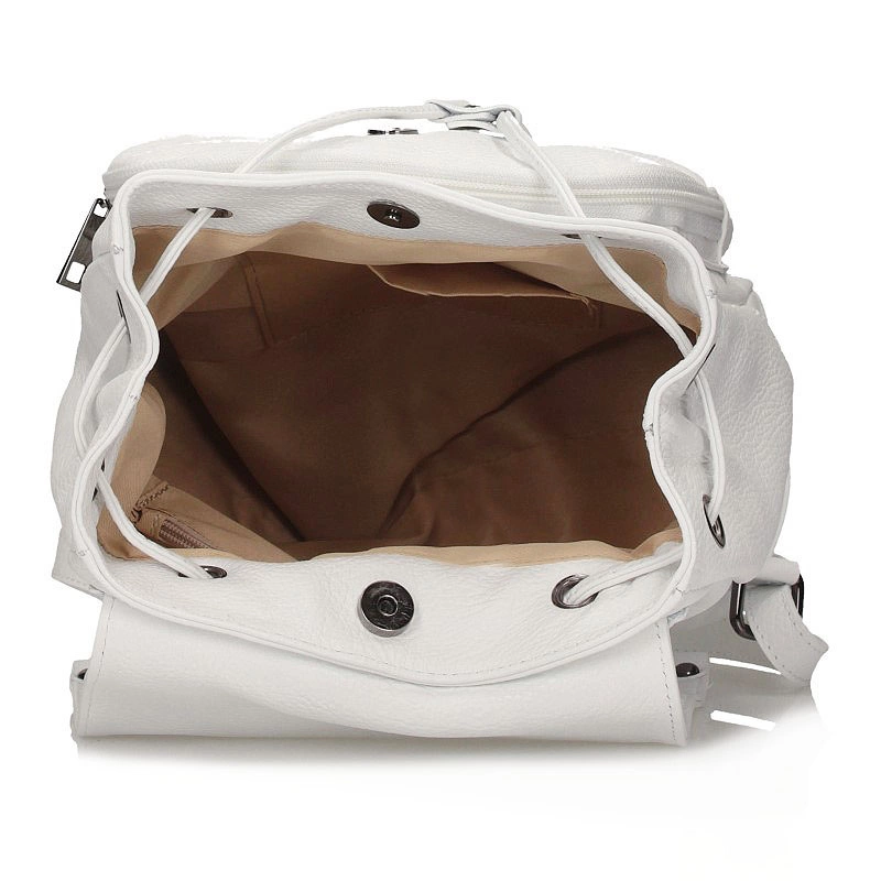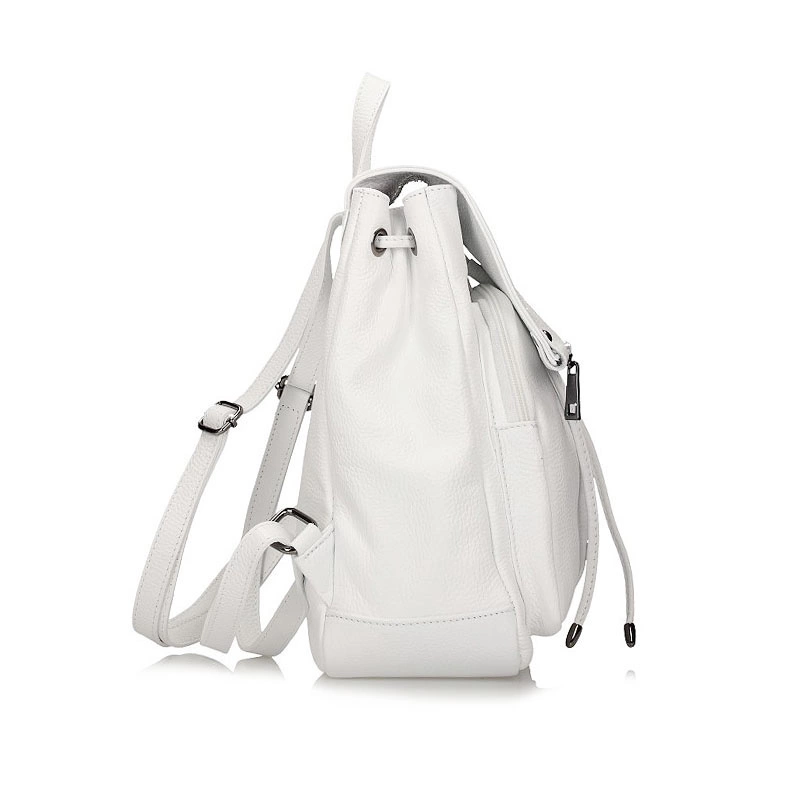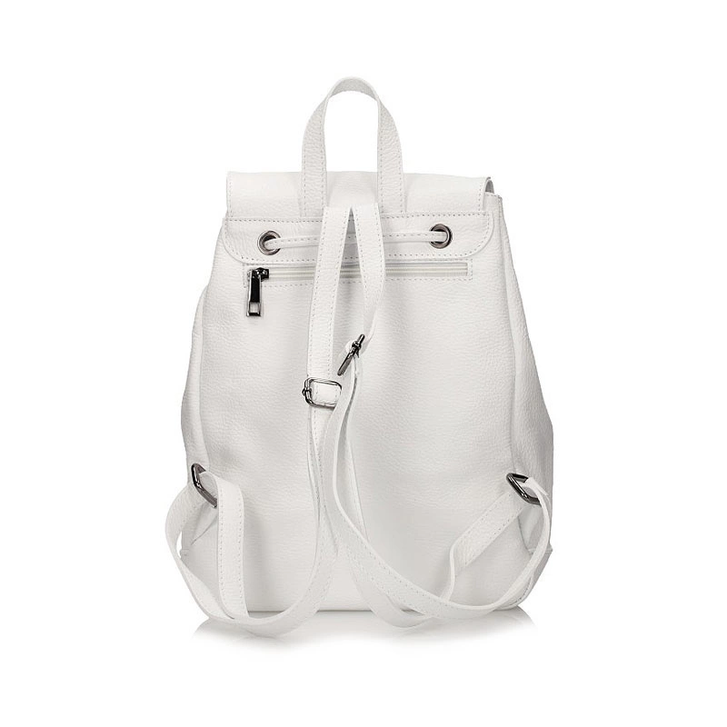 Włoska marka Toscanio prezentuje nam plecak z najnowszej kolekcji. Model został wykonany z wysokiej jakości skóry naturalnej w białym kolorze. Plecak ma klapkę, posiadająca zapięcie na magnes, dodatkowo ukryto w niej kieszeń zapinaną na zamek. Fason posiada jedną komorę, która zapina się na magnes. Wewnątrz znajdziemy kieszonkę na telefon oraz dwie kieszonki zapinające się na zamek. Na przodzie umieszczono większą kieszonkę zapinaną na zamek oraz jedną mniejszą . Plecak posiada regulowane ramiączka, które dopasujemy do własnych potrzeb. Idealnie sprawdzi się w codziennym użytkowaniu, jak i na różnego rodzaju wycieczki.