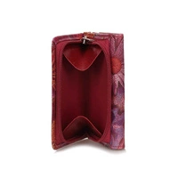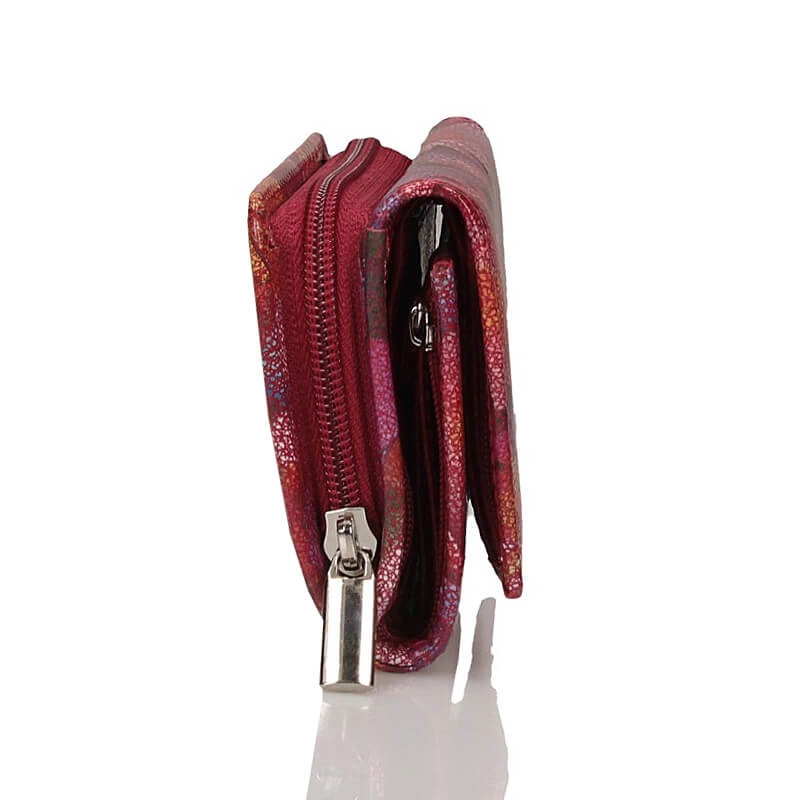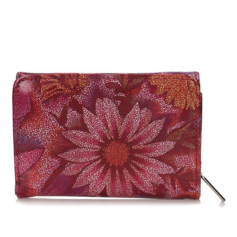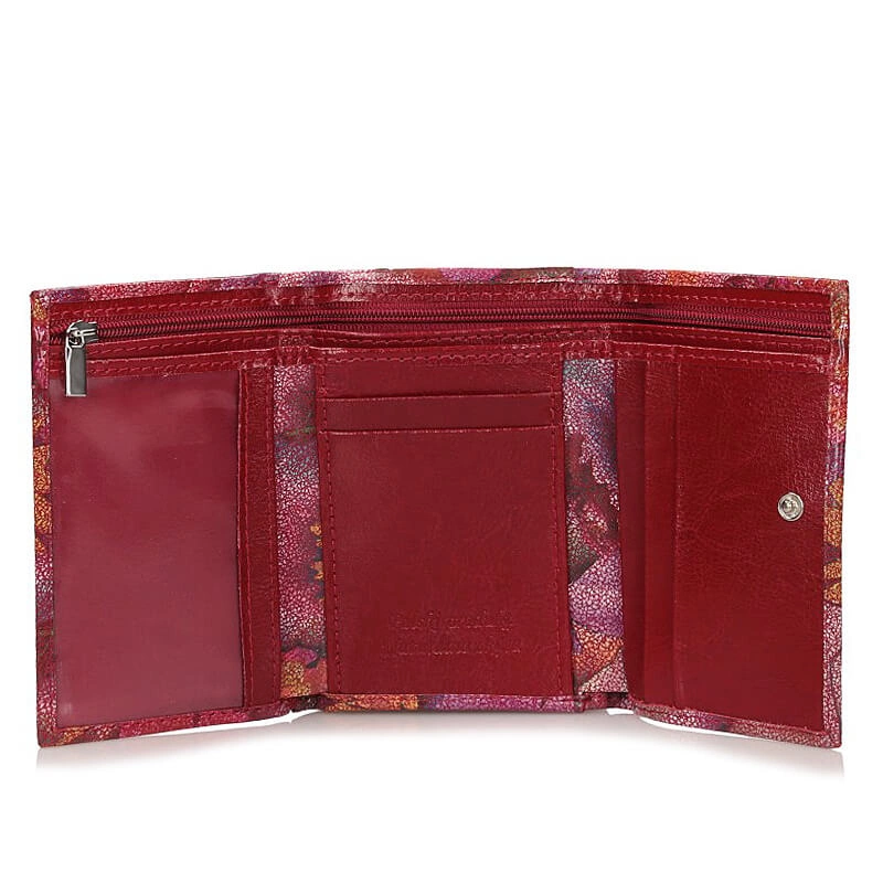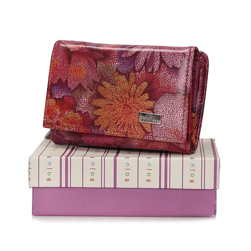 Portfel marki Baju Baj pochodzący z najnowszej kolekcji jesienno-zimowej. Został wykonany z najwyższej jakości skóry naturalnej w kolorze czerwonym z ciekawym motywem kwiatów. Portfel zapinany na zamek oraz zatrzask, wewnątrz znajduje się 5 miejsc na karty, zdjęcie oraz banknoty. Dodatkowo z tyłu znajduje się przegródka na bilony, zapinana na zamek.