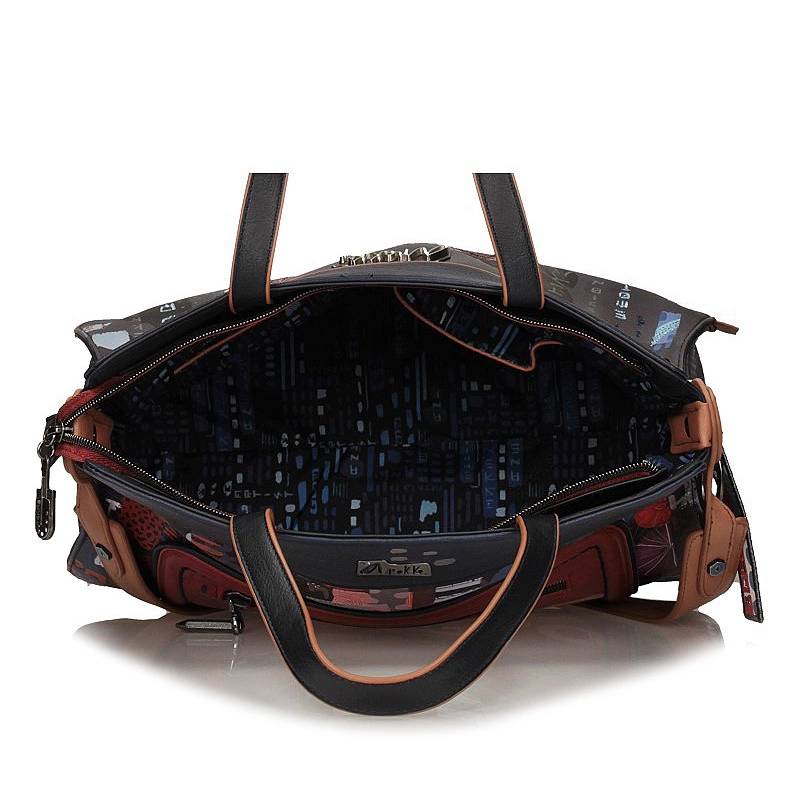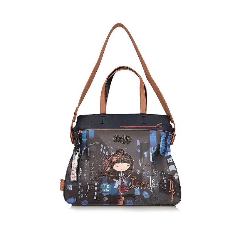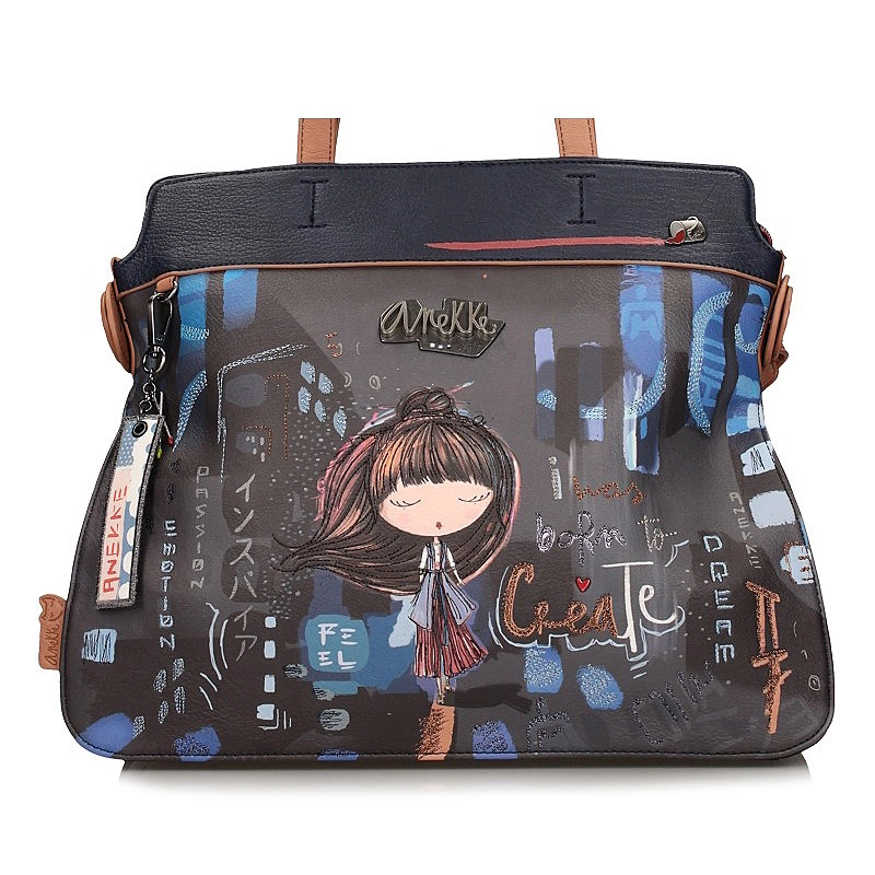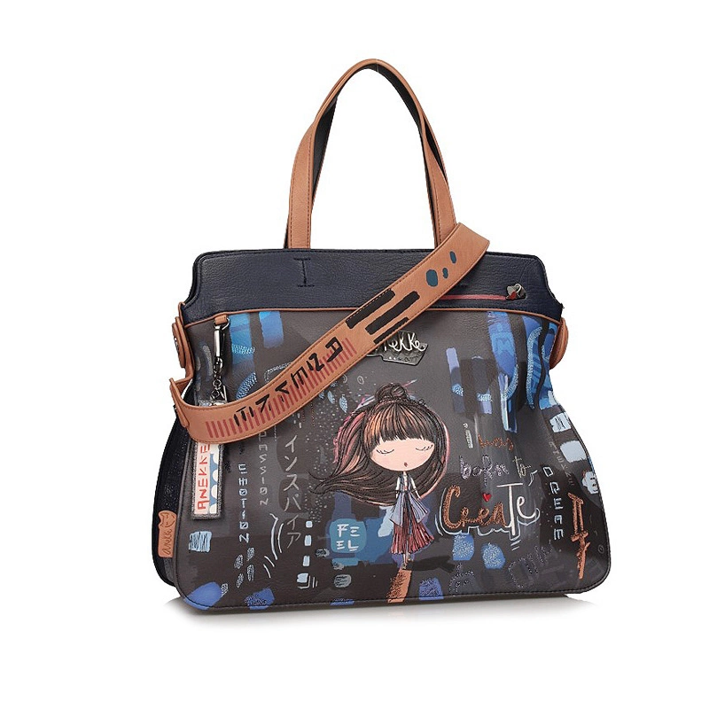 Torebka z najnowszej kolekcji hiszpańskiej marki Anekke Contemporary. W tej limitowanej edycji laleczka porusza się po nowoczesnej Japonii pełnej sztuki, świateł oraz niezapomnianych kolorów. Model jednokomorowy, zapinany na zamek. Wykonana z wysokiej jakości skóry ekologicznej. Wewnątrz torebka została umieszczona kieszonka zapinana na zamek oraz organizer. Model wyposażony w dwie wygodne w użytkowaniu rączki oraz wygodny pasek umożliwiający noszenie torebki na ramieniu. Na tyle torebki znajdziemy dodatkową kieszeń zapinaną na zamek. Piękne przeszycia, dodatki takie jak brelok czy metalowe logo marki sprawiają, że model ten jest niezwykle oryginalny.