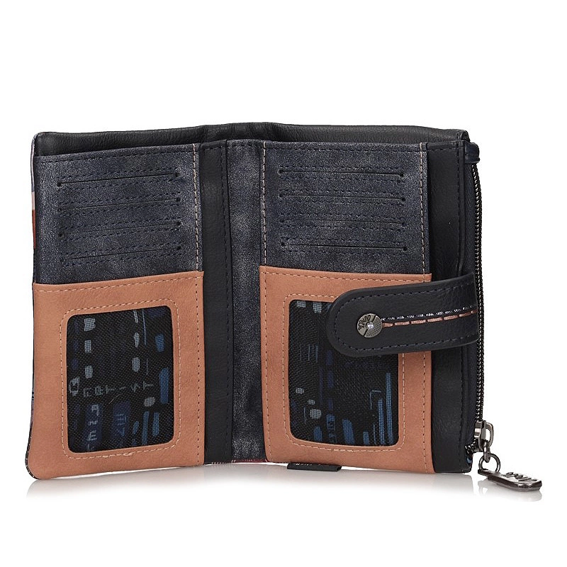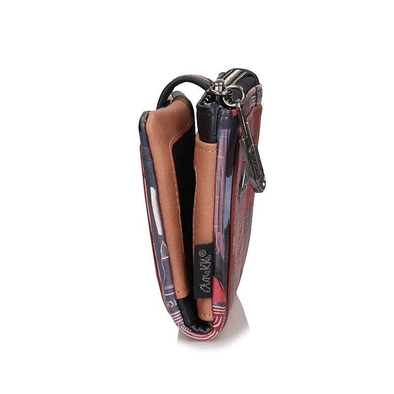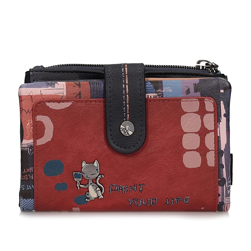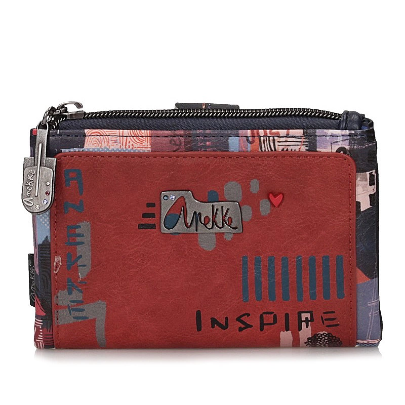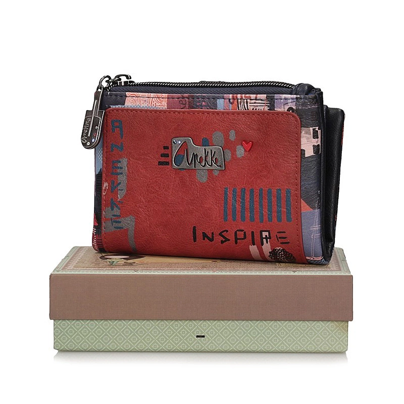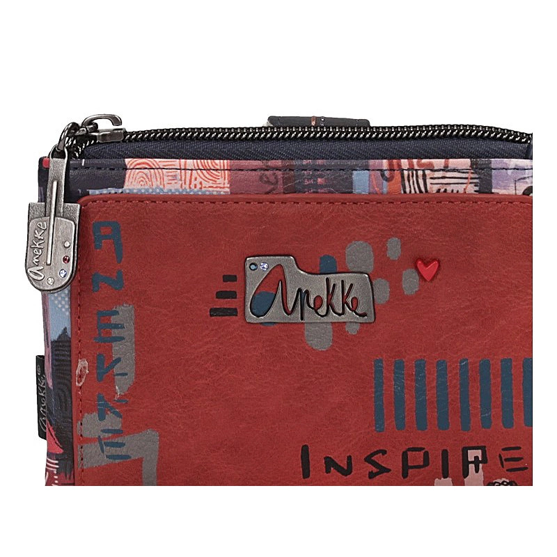 Hiszpańska marka Anekke przedstawia nam portfel z najnowszej kolekcji. Model został wykonany z skóry ekologicznej licowej w odcieniu granatu, łączącego z brązem. Nadruk łączy się z kolekcją Anekke podróżującej po Japonii. Na przodzie możemy zauważyć logo marki, co nadaje portfelowi oryginalnego wyglądu. Tył również został ozdobiony, na którym widać Maneki Neko z pędzlem. Portfel posiada jedna komorę na monety zapinaną na zamek, 7miejsc na karty kredytowe jak i na dowód rejestracyjny. Dodatkowo posiada dwie kieszonki na bilion, w tym jedna zapinana na zamek. Całość wyłożono tkaniną, nawiązującą do kolekcji. A jakby czegoś nie mogło zabraknąć to detali, które czynią ten portfel wyjątkowym.