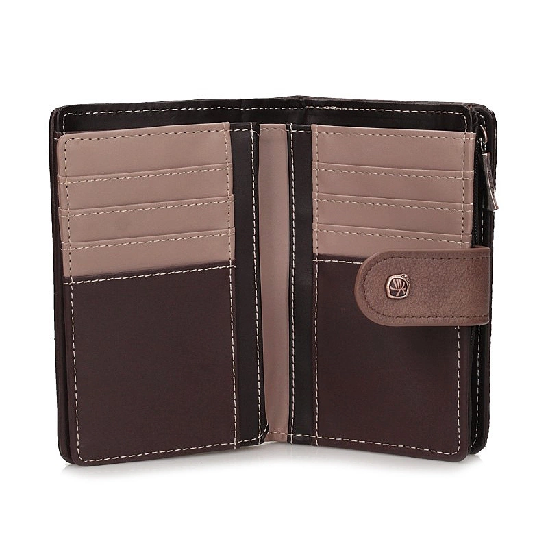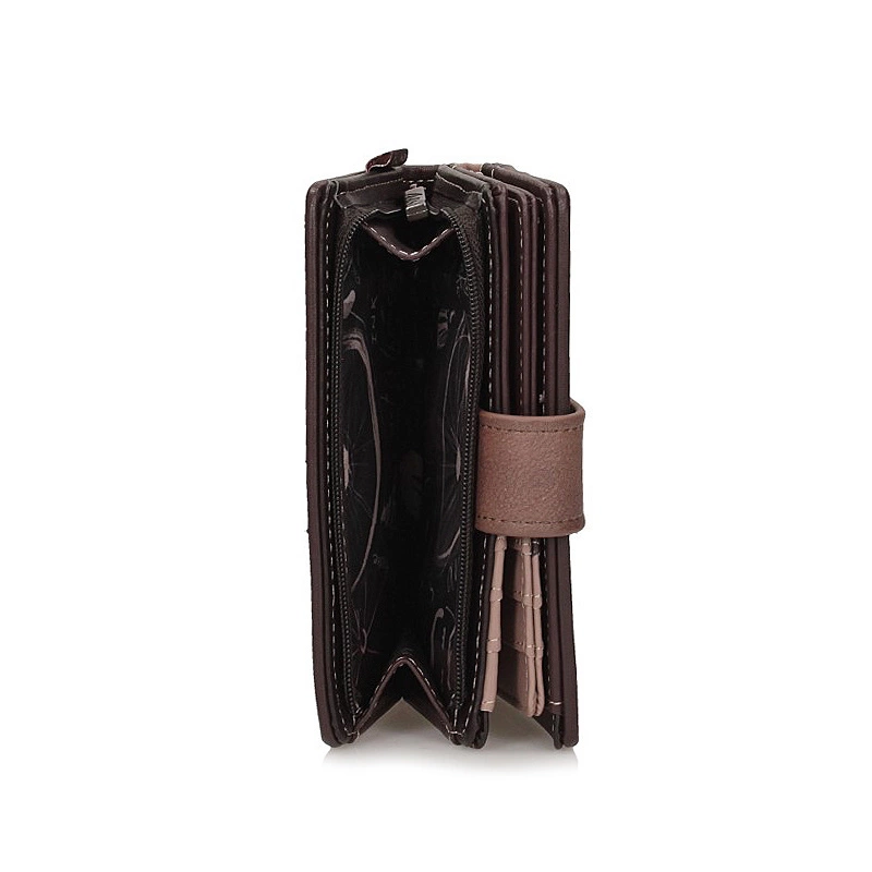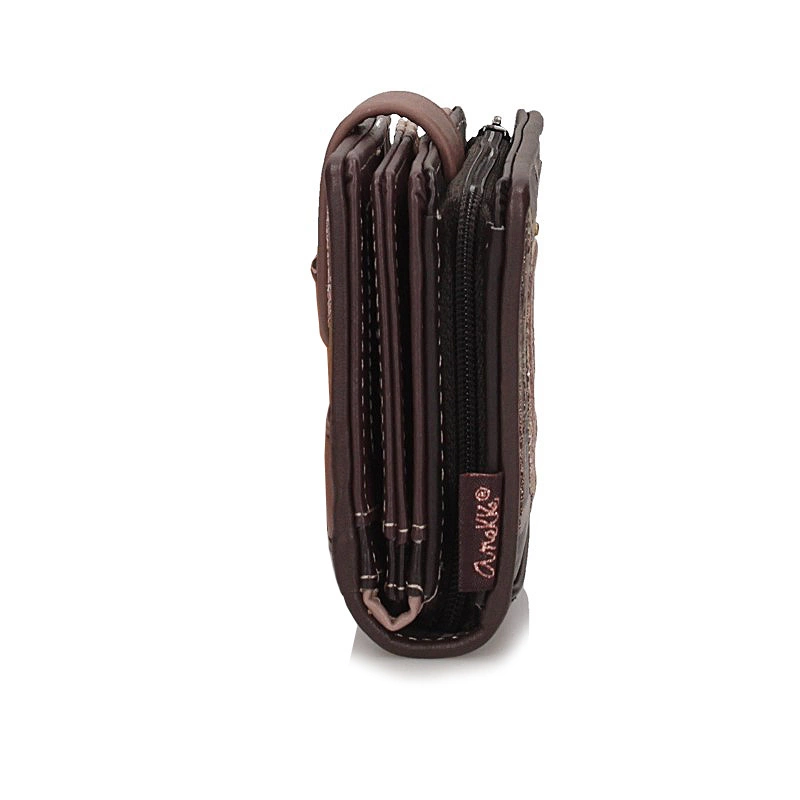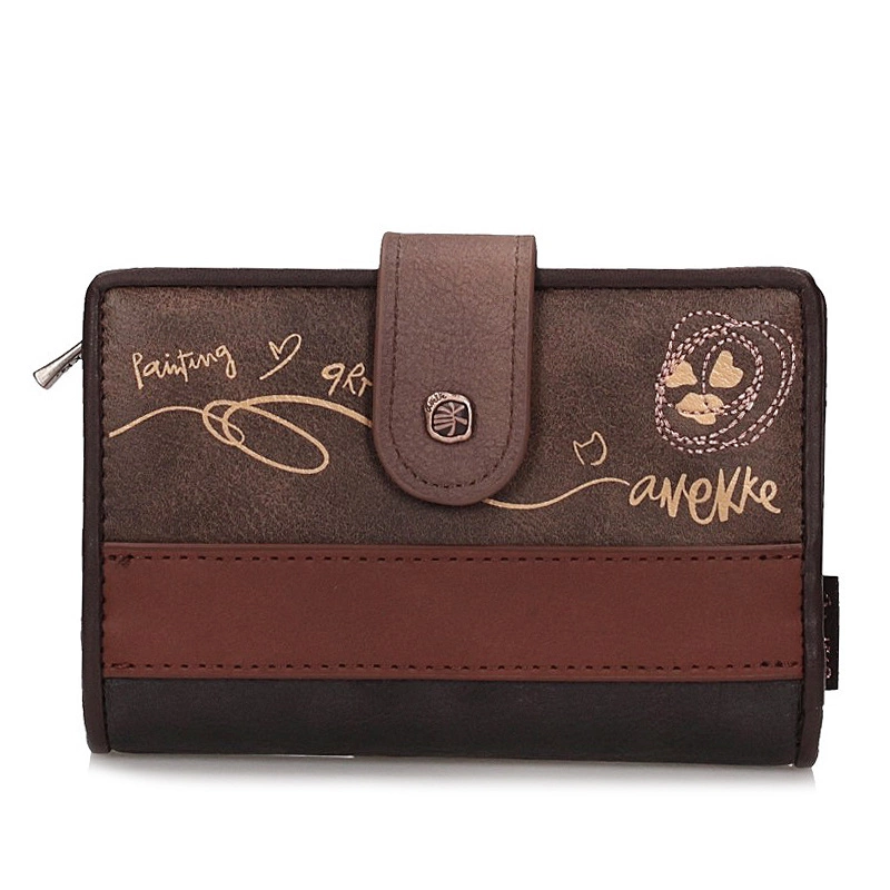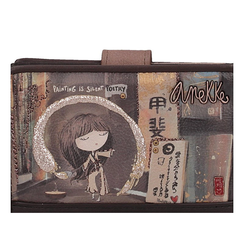 Hiszpańska marka Anekke przedstawia nam portfel damski z najnowszej kolekcji. Model wykonany został z skóry ekologicznej licowej w odcieniu brązu. Grafika przedstawia Anekke ubraną w tradycyjne kimono, wewnątrz malarskiego studia i z pędzlem w dłoni. Okrąg, który zakreśla wokół siebie symbolizuje moment przepływu inspiracji. Cały projekt ozdobiony jest mnóstwem intrygujących szczegółów nawiązujących do japońskiej i malarskiej stylistyki projektu, takich, jak wykończenia zamków w kształcie pędzla i palety, metaliczne hafty, ozdobne nity między innymi przedstawiające tradycyjne japońskie buty, oraz tabliczkę pokrytą japońskim pismem, naszywki. Model został wyposażony w RFID: zabezpiecza on nasze karty przed sczytaniem naszych danych z kart i pobrania z niej środków.
