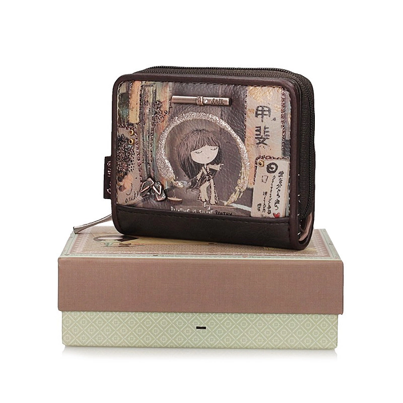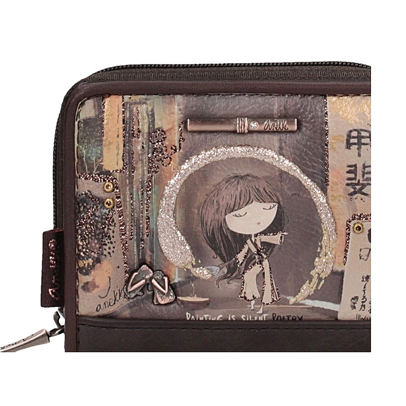 Hiszpańska marka Anekke przedstawia nam portfel z najnowszej kolekcji. Model wykonany z skóry ekologicznej licowej w odcieniu brązu.  Kolekcja ta inspirowana jest postacią malarki. Dzięki niej malarstwo w Japonii  stało się   kobieca profesją. Grafika przedstawia Anekke ubraną w tradycyjne kimono wewnątrz malarskiego studia i z pędzlem w dłoni. Okrąg, który zakreśla wokół siebie symbolizuje moment przepływu inspiracji. Uroczy portfel z motywem kolekcji Anekke   ma miejsce na monety, a także banknoty i karty. Portfel posiada RFID: to system zabezpieczający przed sczytaniem danych z naszych kart oraz pobraniem z niej środków.