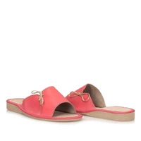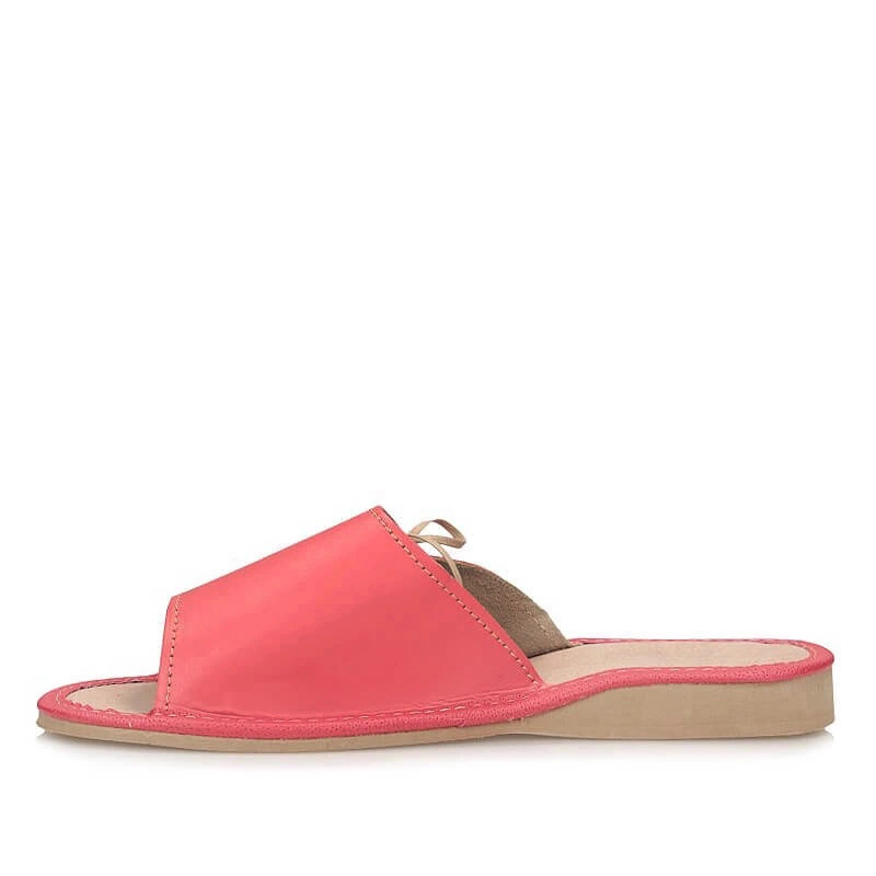 Kapcie domowe damskie z najnowszej kolekcji wiosenno-letniej. Model został wykonany z wysokiej jakości skóry naturalnej licowej w kolorze różowym. Wkładka została wykonana z delikatnej i przyjaznej dla stóp skóry naturalnej w jasnym kolorze. Podeszwa obuwia wykonana z wysokogatunkowego tworzywa sztucznego.