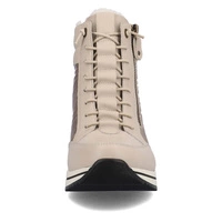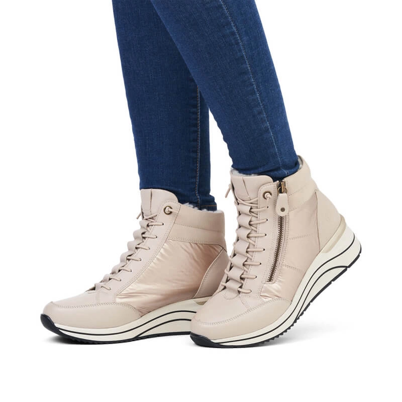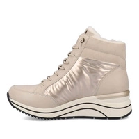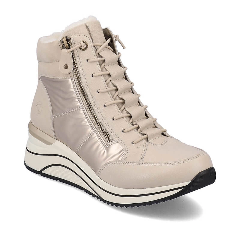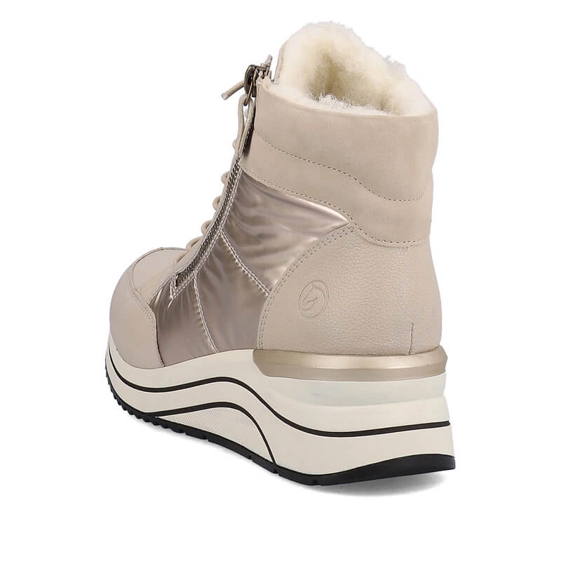 Botki niemieckiej marki Remonte pochodzące z najnowszej kolekcji jesienno-zimowej. Wykonane z wysokiej jakości ekologicznej skóry oraz wysokiej jakości tkaniny. Nosek zaokrąglony, szerszy, który umożliwia prawidłowe rozłożenie palców co zwiększa komfort użytkowania. Wyposażony w system Lite"s Soft - zapewniający lekkość . Zapinane na boczny zamek. Z przodu sznurowanie, które gwarantuje dopasowanie tęgości do stopy, a jednocześnie stabilizuje kostkę podczas chodzenia. Oryginalności dodają wstawki metalicznego, mieniącego się materiału. Wnętrze całościowo wyściełane naturalną owczą wełną - możemy być pewni i spokojni o nasze stopy w największe chłody nadchodzącego zimowego sezonu . Całość osadzona na podeszwie w jasnym kolorze z ciemnymi zdobieniami. Z przodu platforma o grubości 1,5 cm, tylny klin o wysokości 5 cm. Dbając systematycznie i przy użyciu odpowiednich środków konserwująco-czyszczących botki posłużą nam wiele sezonów. Podeszwa wykonana z odpornego na ścieranie tworzywa, amortyzująca wstrząsy oraz zapewniająca odpowiednią pozycje naszego kręgosłupa. Wybierając prezentowany model cieszysz się wygodną, modnym fasonem i spokojem o komfort cieplny stóp które niosą nas przez całe życie i zasługują na to co najlepsze.