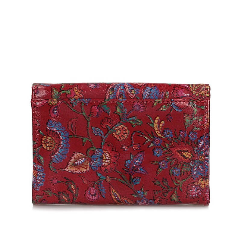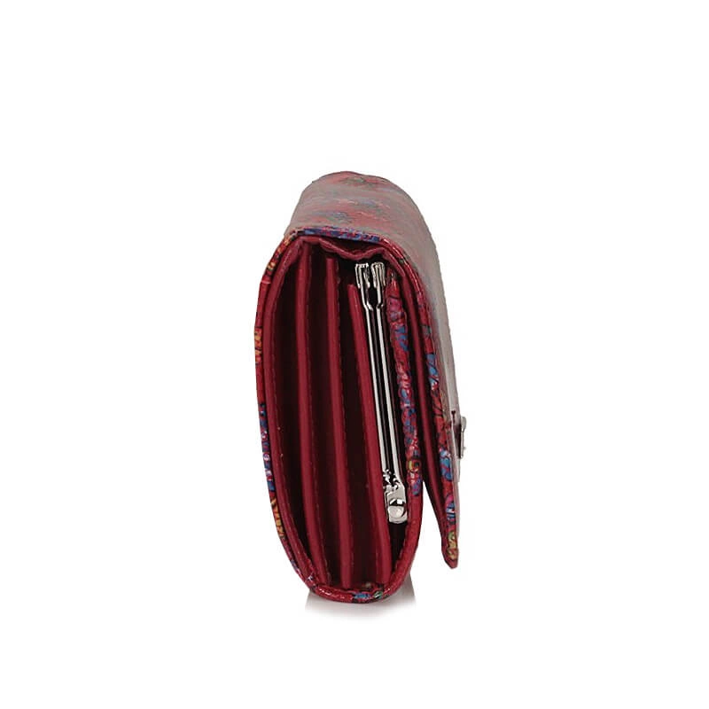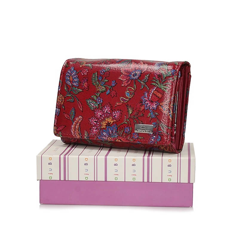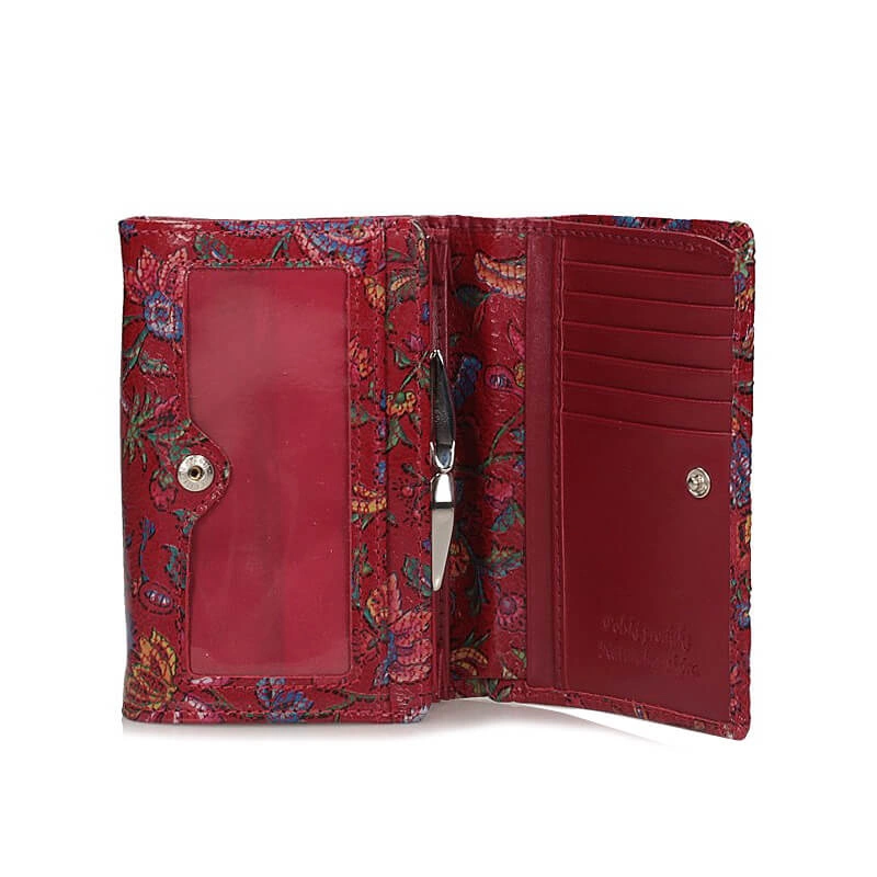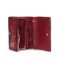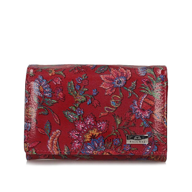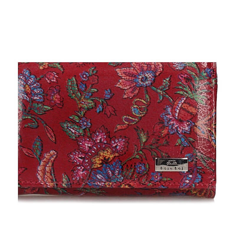 Najnowszy model portfela polskiej marki Baju Baj. Model wykonany ze skóry naturalnej w kolorze czerwonym, z motywem w kolorowe kwiaty. W środku ma dziewięć miejsc na karty, oraz pięć komór na monety, zamykane na bigiel. Portfel ma również jedną dużą komorę na banknoty. Model jest zamykany za zatrzask. Ma srebrne wykończenia.