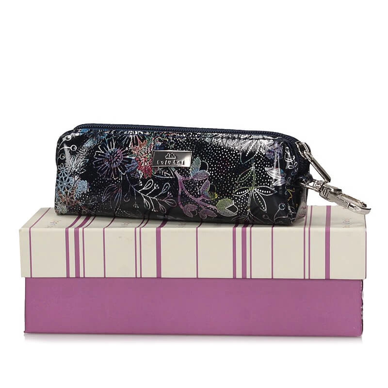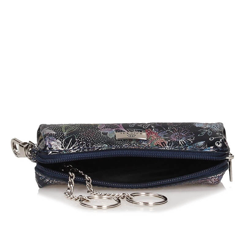 Etui na klucze w kolorze czarnym z kwiatowym wzorem od marki Baju Baj. Model ten wykonano z wysokiej jakości skóry naturalnej. Zapinane na zamek. Wewnątrz posiada dwa kółeczka z łańcuszkami do przypięcia kluczy. Zewnętrzny karabińczyk umożliwia dopięcie etui w dowolnym dla nas miejscu. Wewnątrz etui wyściełane tkaniną.