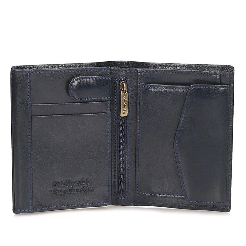 Polska marka Canaletto przedstawia portfel z nowej kolekcji jesienno-zimowej. Model jest wykonany ze skory naturalnej w pięknym granatowym kolorze. Wewnątrz znajdują się miejsca na różne karty, miejsce na banknoty i monety. Portfel idealny na prezent.