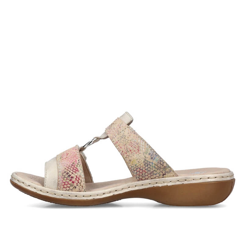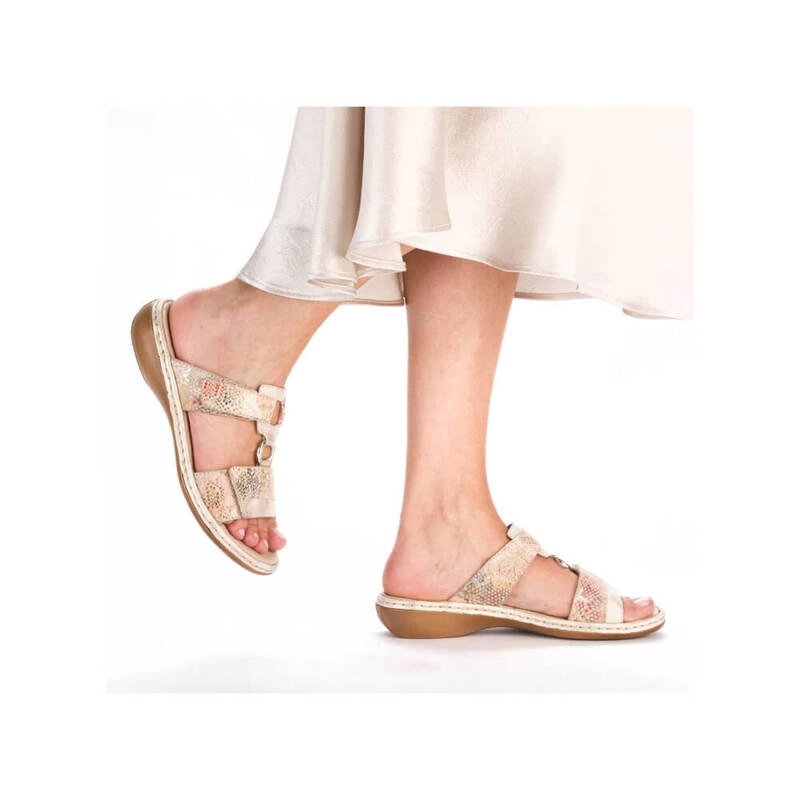 Klapki z najnowszej kolekcji wiosenno-letniej przedstawia nam lubiana przez klientki niemiecka marka Rieker. Cholewkę wykonano z najwyższej jakości skóry ekologicznej w beżowym odcieniu z połączeniem kolorowych elementów. Wkładkę wyściełano przyjemną dla stopy skórą naturalną, która zapewni wygodę oraz komfort podczas użytkowania. Model posiada zapięcia na rzepy umożliwiające dopasowanie obuwia do tęgości stopy. Odporna na ścieranie podeszwa została wykonana z wysokogatunkowego tworzywa sztucznego. Idealne do codziennego użytkowania.