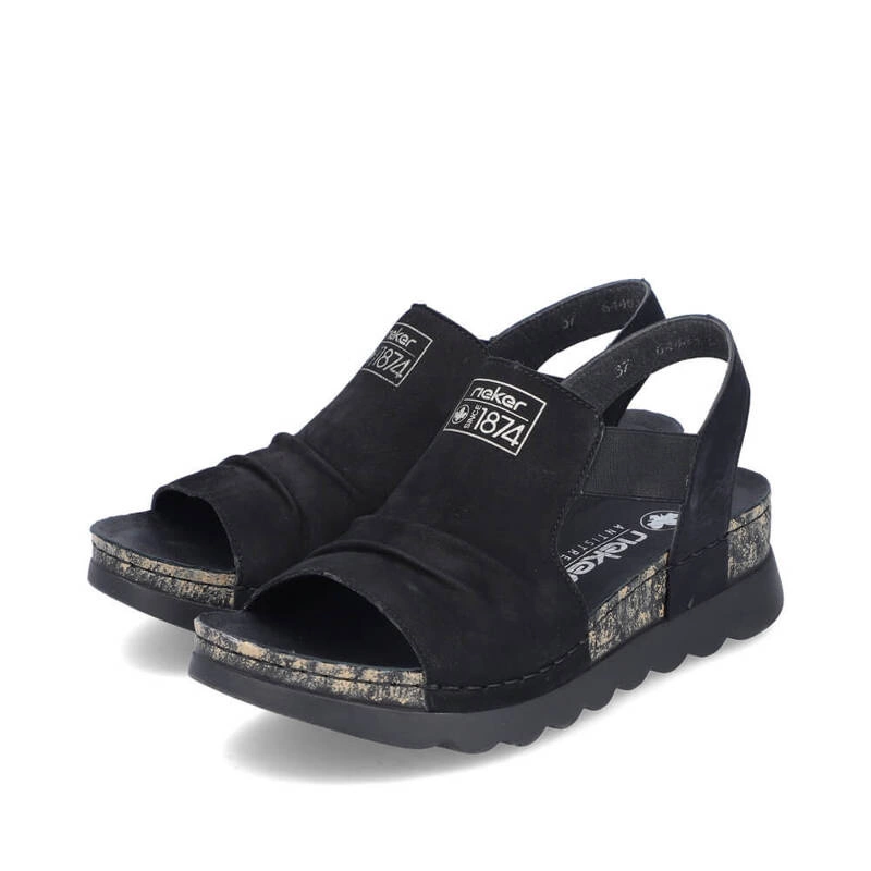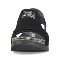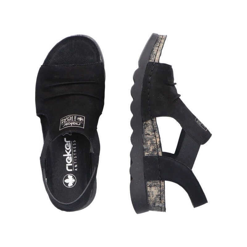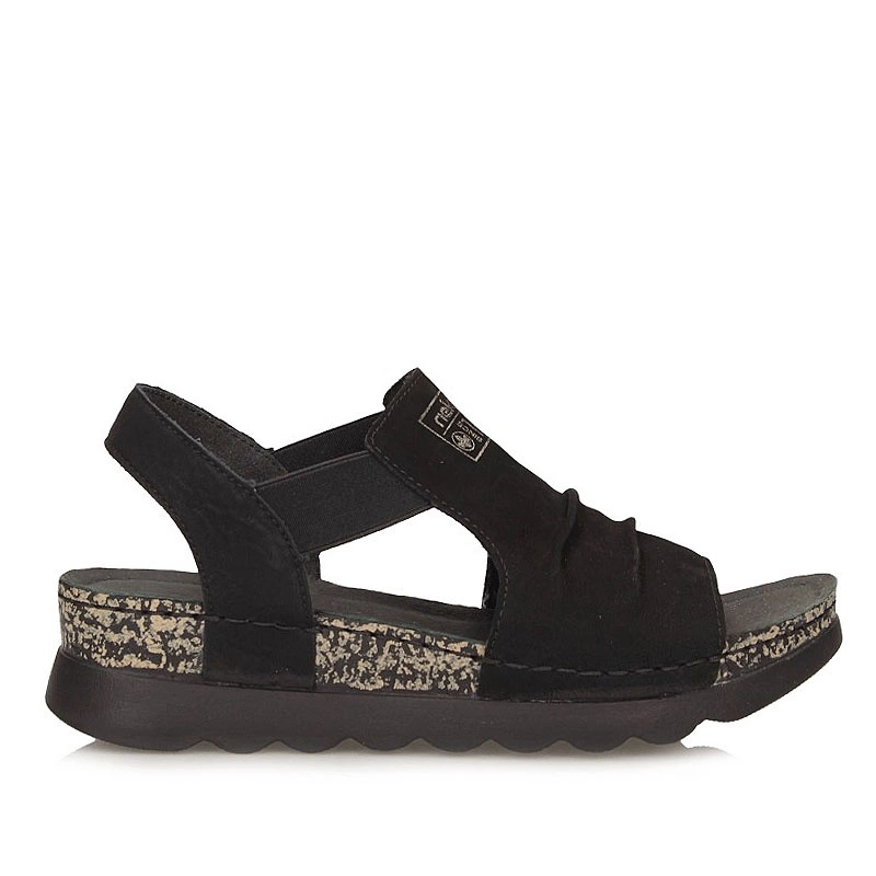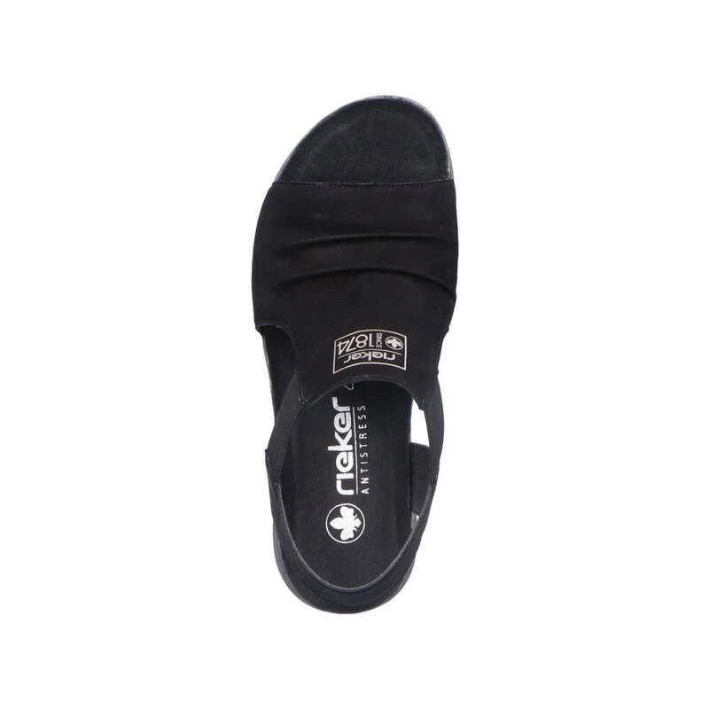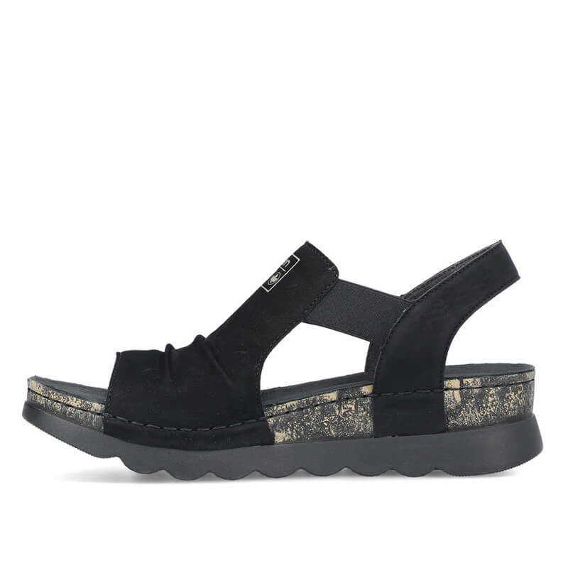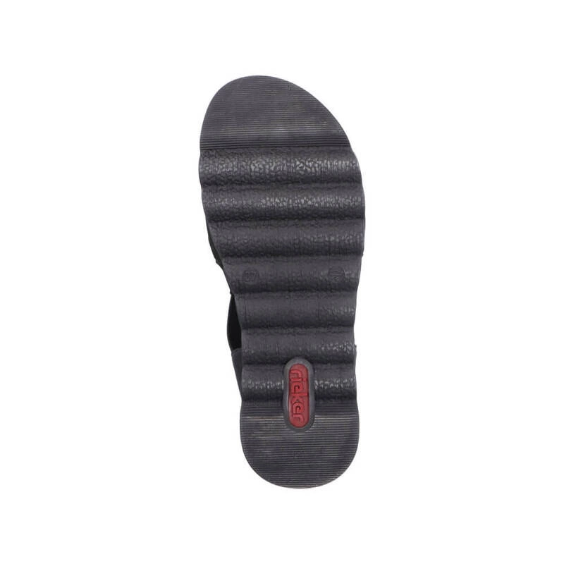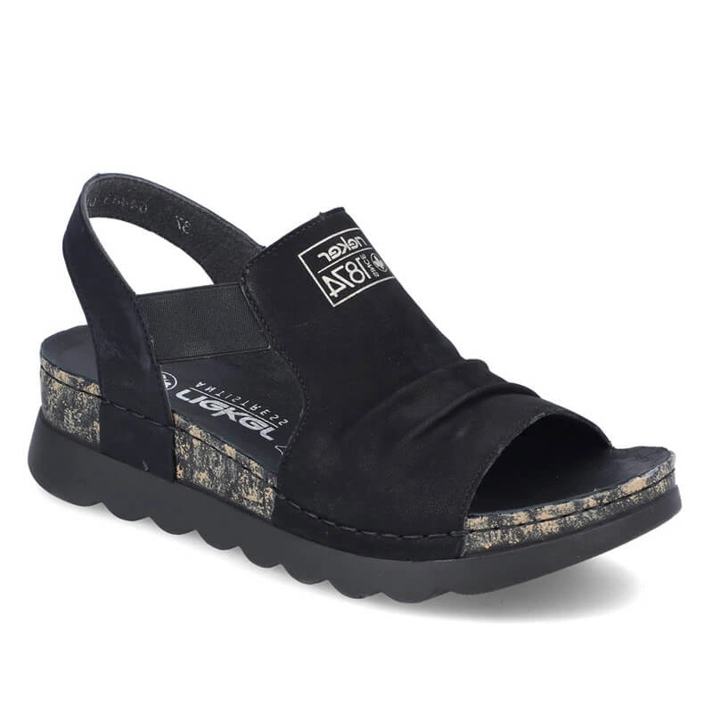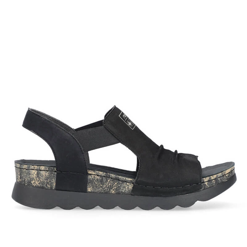 Sandały damskie niemieckiej marki Rieker pochodzące z najnowszej kolekcji wiosenno-letniej. Cholewka obuwia została wykonana z wysokiej jakości skóry naturalnej nubukowej w kolorze klasycznej czerni. Nosek obuwia został odkryty, szeroki pozwalający swobodnie rozłożyć palce, o kształcie okrągłym. Wkładka została wykonana ze skóry naturalnej, umożliwiająca przepuszczalność powietrza odpowiadająca za wygodę naszych stóp. Model wsuwany na gumce co , pozwoli nam na szybkie i bezproblemowe założenie sandała. Podeszwa wykonana z wysokiej jakości tworzywa sztucznego, z właściwościami antypoślizgowymi. Całość świetnie podkreśla logo umieszczone na cholewce obuwia, które nadaje mu oryginalności. Model został wykonany z dbałością o każdy detal. Z pewnością przypadnie do gustu wielu Paniom.