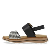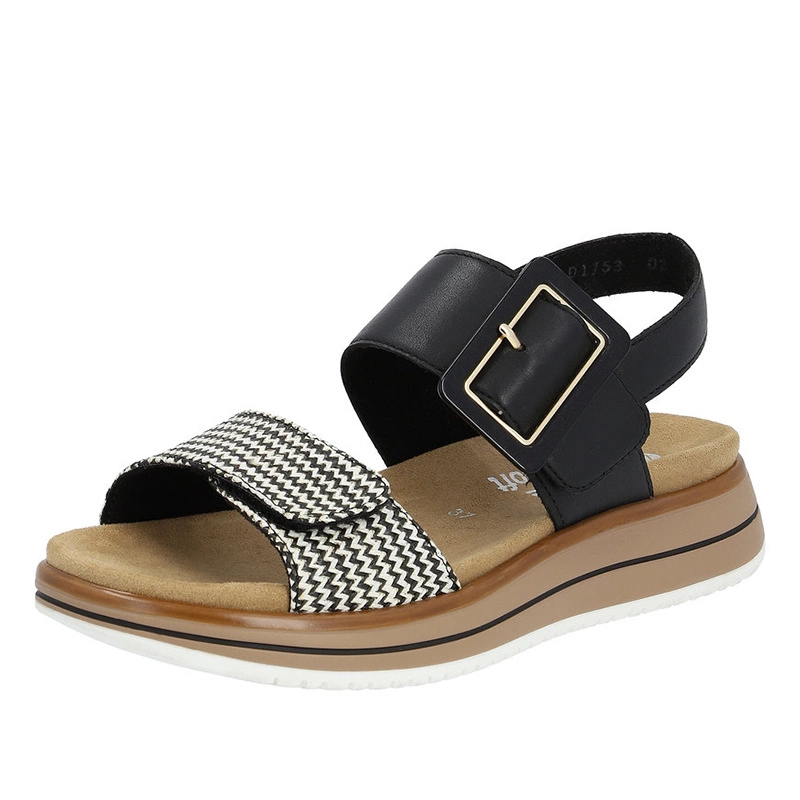 Sandały znanej i cenionej marki Remonte pochodzące z najnowszej kolekcji wiosenno-letniej. Cholewka obuwia została wykonana z wysokogatunkowego materiału tekstylnego z połączeniem najwyższej jakości skóry naturalnej licowej w czarno-białym odcieniu. Wkładkę wnętrza modelu wyściełano wysokiej jakości skórą ekologiczną, która umożliwia wygodne i komfortowe użytkowanie obuwia. Model zapinany na rzep, który umożliwia idealne dopasowanie obuwia do tęgości stopy oraz ułatwia bezproblemowe oraz szybkie zakładanie. Podeszwa sandałów została wykonana z wysokiej jakości tworzywa sztucznego odpornego na ścieranie. Całość osadzona na płaskim obcasie. Producent dodatkowo dołączył zawieszkę, która dodaje obuwiu oryginalnego wyglądu. Piękny model idealnie sprawdzi się do wielu wiosenno-letnich stylizacji.