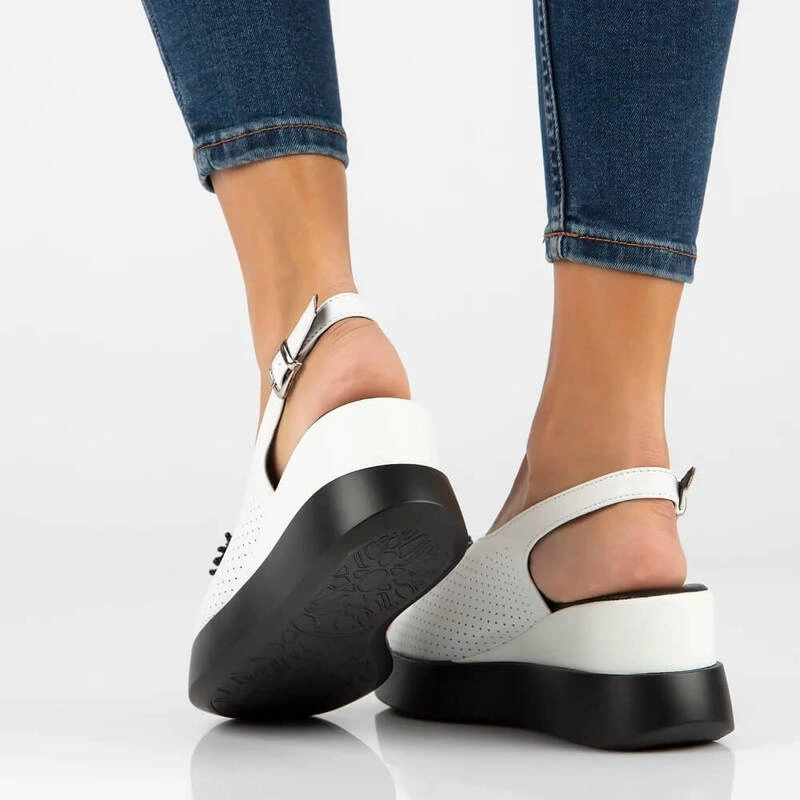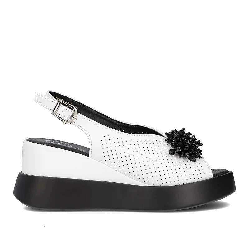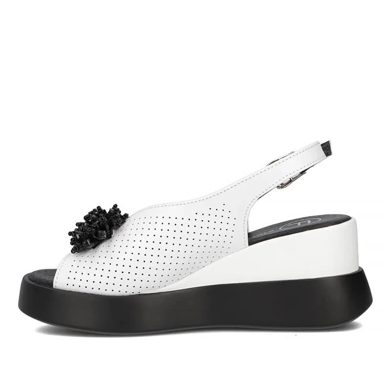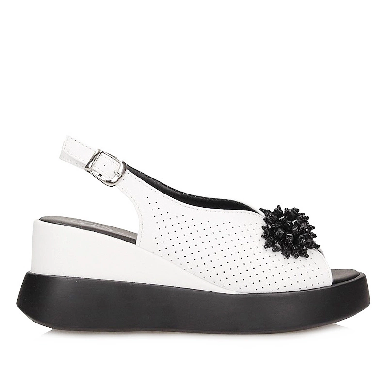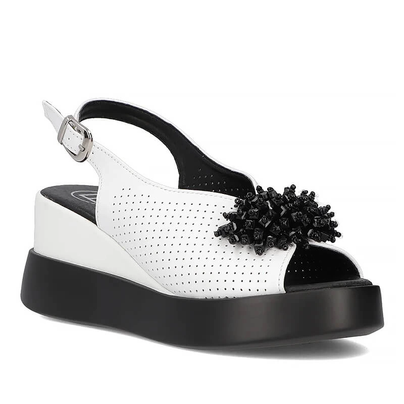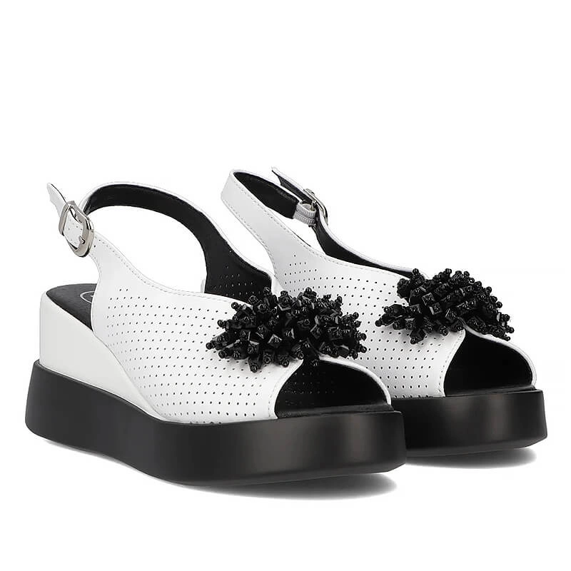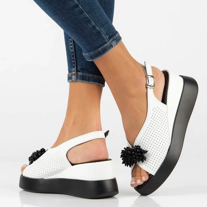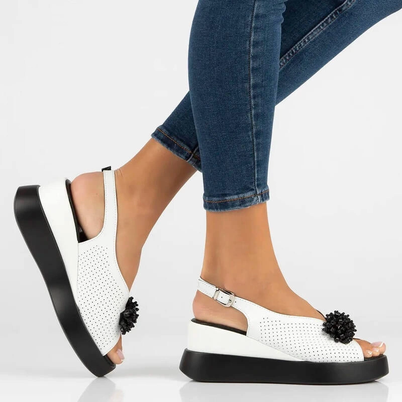 Sandały znanej i lubianej marki Filippo pochodzące z najnowszej kolekcji. Zostały wykonane z wysokiej jakości skóry naturalnej licowej w kolorze białym i czarnym. Wkładka wykonana ze skóry naturalnej odpowiadająca za wygodę stóp. Zapiane na sprzączkę , która gwarantuje stabilność podczas użytkowania. Na przodzie zostały ozdobione czarnymi koralikami które świetnie będą pasować do wielu stylizacji. Całość osadzona na 6,5 cm koturnie. Dzięki swojemu klasycznemu kolorowi dopasujemy do wielu stylizacji.