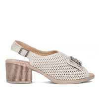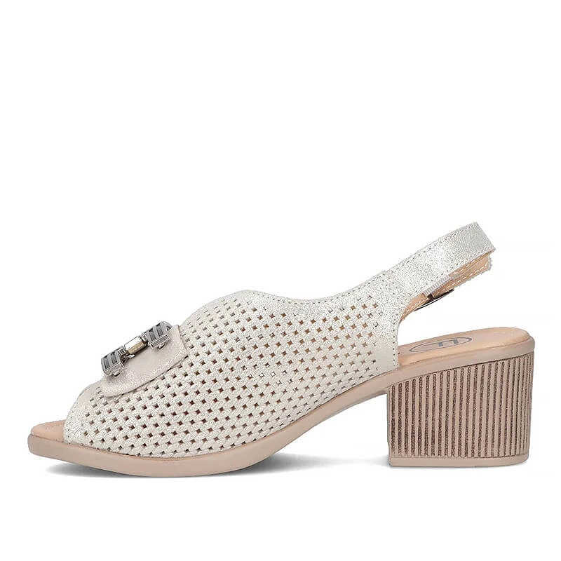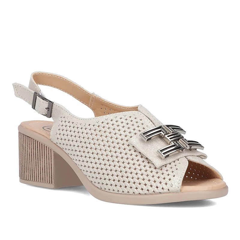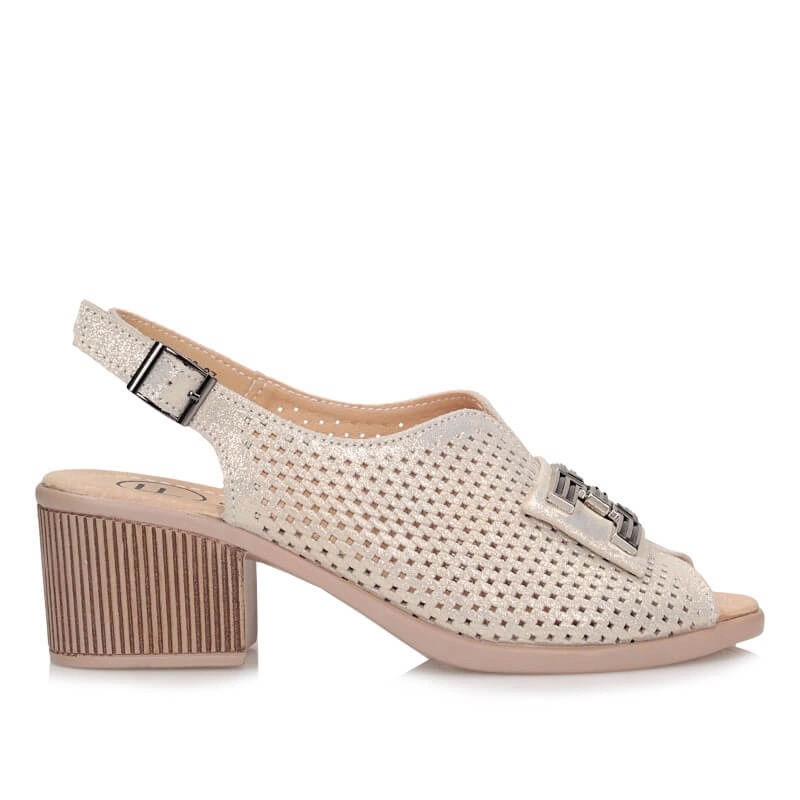 Sandały znanej marki Filippo pochodzące z najnowszej kolekcji wiosenno-letniej zostały wykonane ze skóry naturalnej w kolorze złotym. Model posiada ażurową cholewkę z wyciętym noskiem. Sandałki zapinane są na sprzączkę, co umożliwia wygodne zakładanie jak i ściąganie ich. Przód cholewki dodatkowo zdobi srebrna ozdoba. Całość umieszczono na grubym korku o wysokości 6 cm. Podeszwa natomiast jest trwała i odporna na ścieranie.