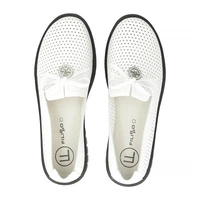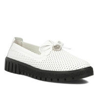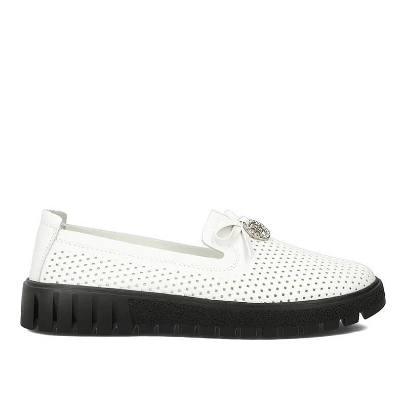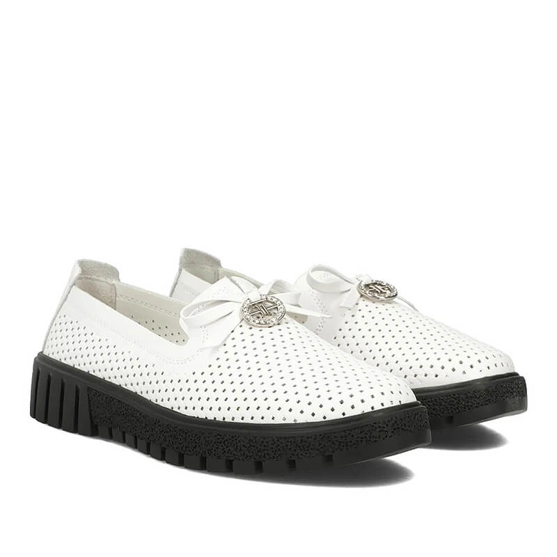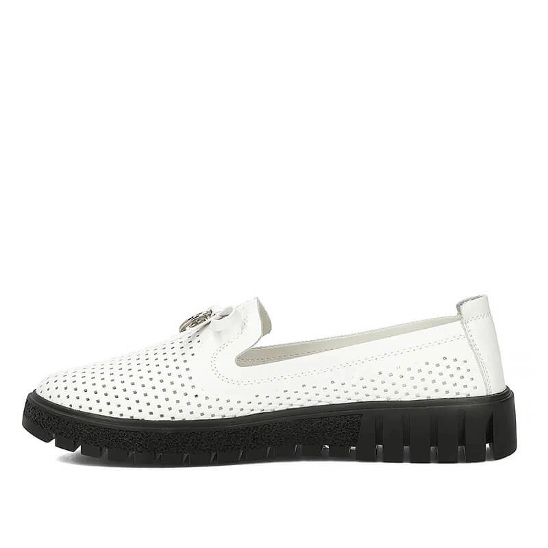 Półbuty znanej marki Filippo pochodzące z najnowszej kolekcji. Cholewka całościowo wykonana ze skóry naturalnej w białym odcieniu. Nosek zaokrąglony, lekko uniesiony ku górze. Wnętrze jak i wkładka modelu są wykonane ze skóry ekologicznej w połączeniu z wysokogatunkowa skóra naturalną. Dzięki temu, że but jest wsuwany sprawnie go założymy jak i zdejmiemy, a także idealnie dopasuje się do tęgości  i kształtu naszej stopy. Pogrubiona podeszwa, wykonana z wysokojakościowego tworzywa sztucznego. Model posiada ozdobę na przodzie cholewki, która nadaje mu elegancji.  Dzięki klasycznemu kolorowi obuwie dopasujemy do każdej wiosenno-letniej stylizacji.