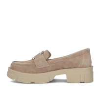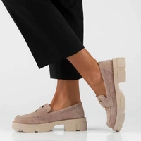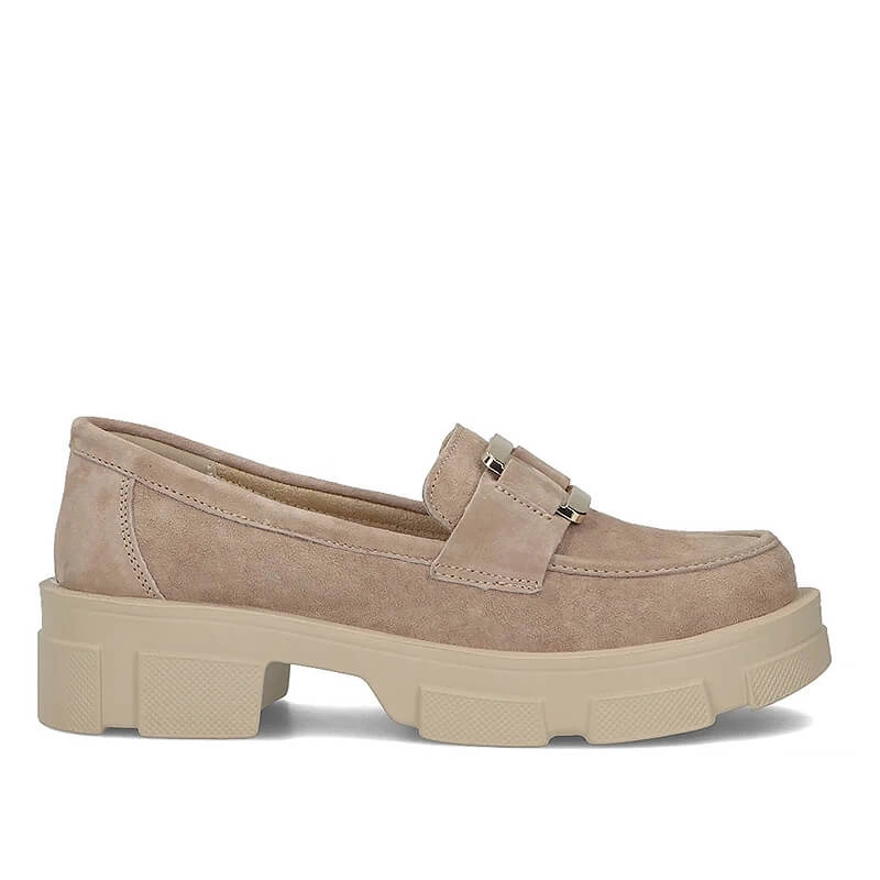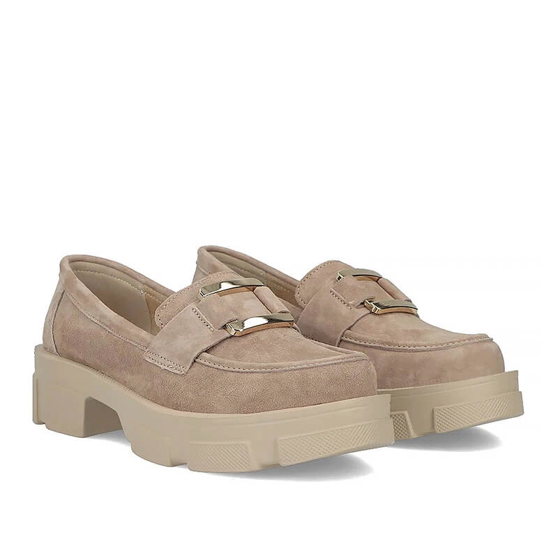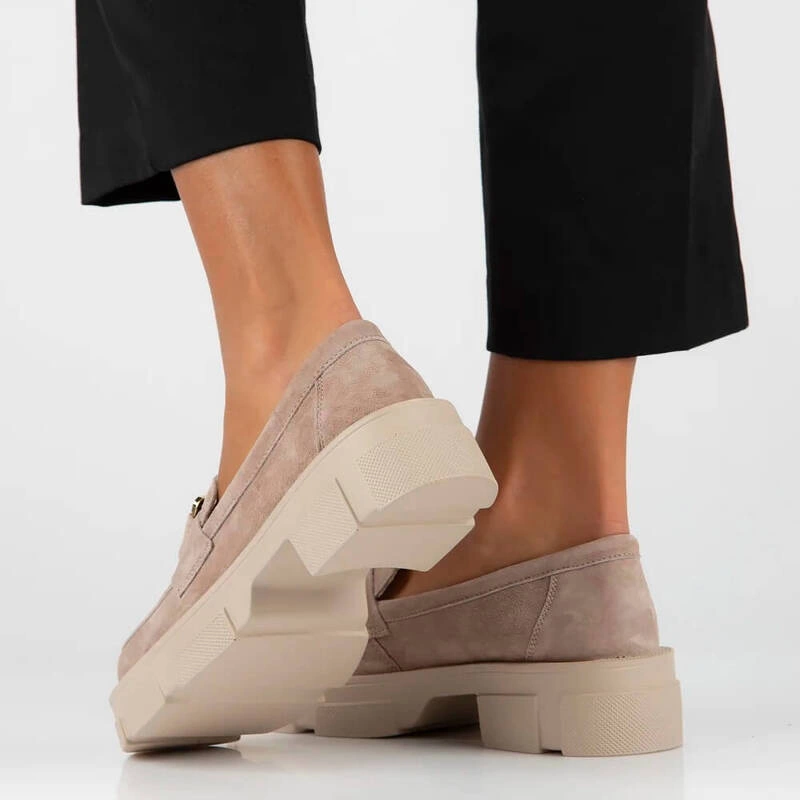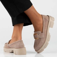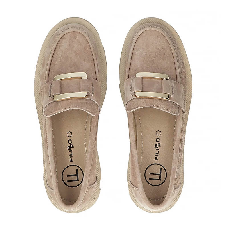 Półbuty znanej marki Filippo pochodzące z najnowszej kolekcji wiosenno-letniej. Obuwie wykonane z wysokiej jakości skóry naturalnej nubukowej w kolorze beżowym. Wnętrze wyściełano przyjemną dla stopy tkaniną. Wkładkę natomiast wykonano z skóry naturalnej. Nosek o kształcie migdałowym, pozwalający na swobodne rozłożenie palców. Model wsuwany umożliwiający na jego szybkie zakładanie. Podeszwa 4.5cm obcasem wykonana z tworzywa sztucznego. Model został ozdobione złotą modną w tym sezonie klamrą. Idealnie będą pasować do wielu stylizacji.