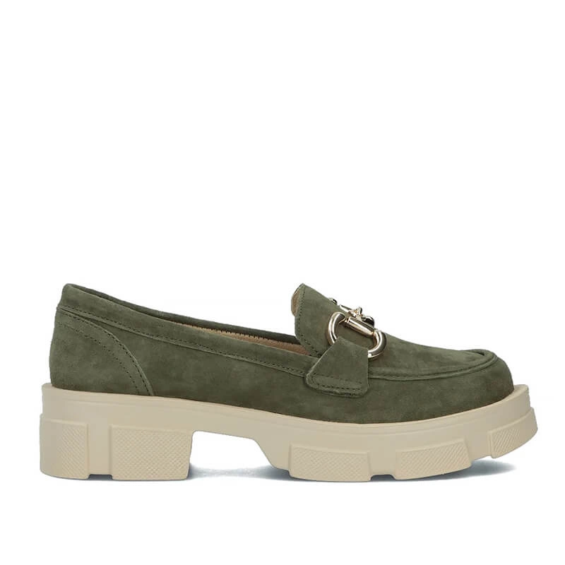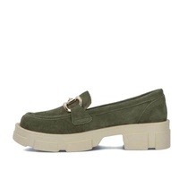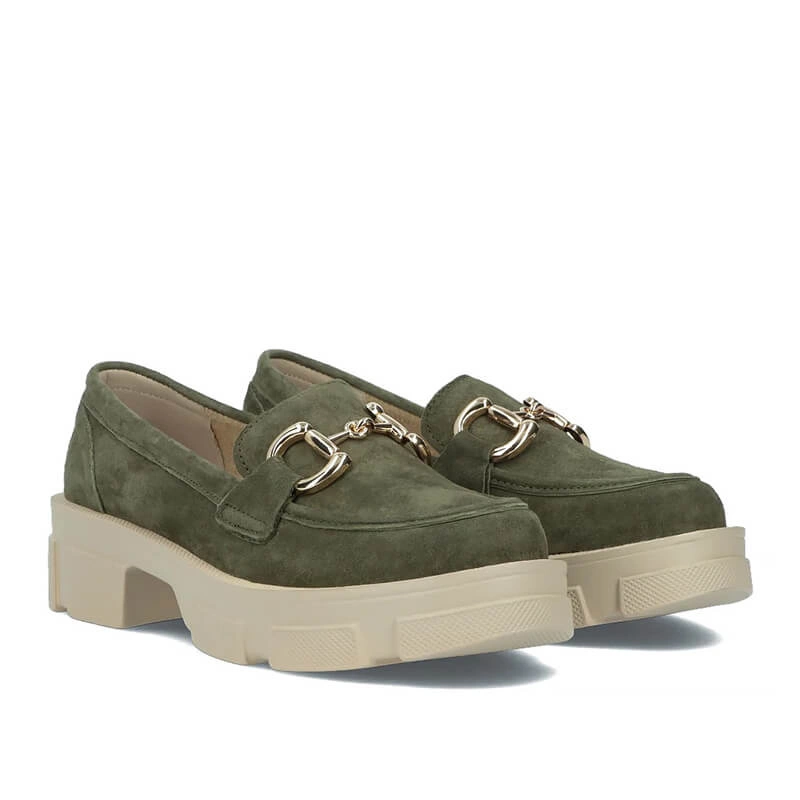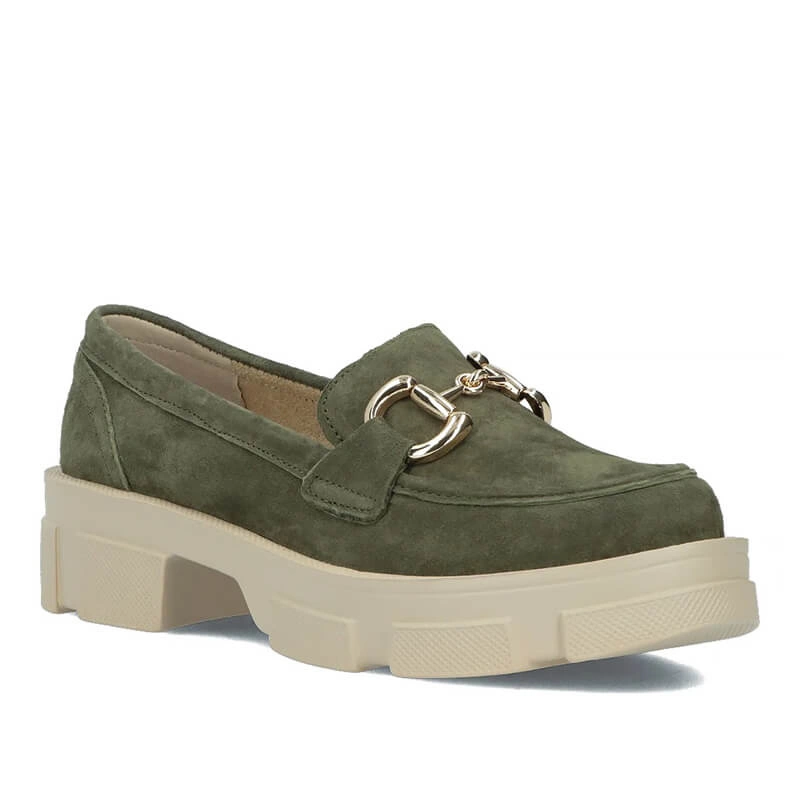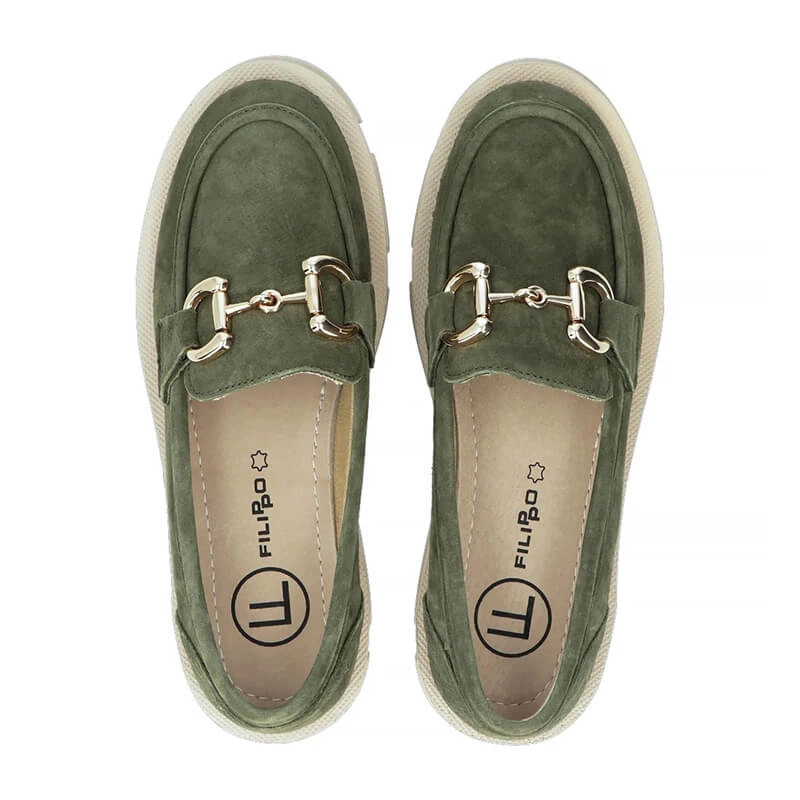 Znana oraz lubiana marka Filippo w nowym sezonie stawia na klasykę połączoną z oryginalnością. Nowy model półbutów w odcieniu khaki wykonany został z wysokiej jakości zamszowej skóry naturalnej. Wnętrze wyściełano skórą naturalną oraz przyjemną dla stopy tkaniną. Mokasyny ozdobiono na cholewce złotym łańcuchem. Uwagę warto zwrócić na kontrast koloru cholewki i podeszwy. Stabilny obcas o wysokości 4 cm zapewni odpowiednią postawę naszego ciała. Fason wsuwany, który umożliwi nam szybkie zakładanie oraz zdejmowanie. Odporna na ścieranie podeszwa została wykonana z trwałego tworzywa sztucznego. Idealnie sprawdzi się w wielu damskich stylizacjach.