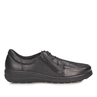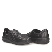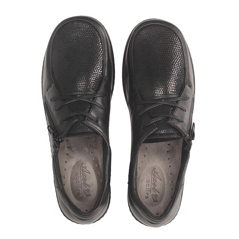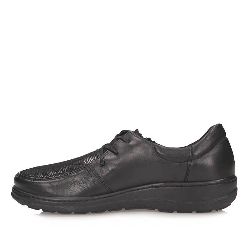 Półbuty marki Axel pochodzą z najnowszej kolekcji wiosenno-letniej. Cholewka wykonana została z naturalnej bardzo miękkiej licowej skóry oraz materiału typu strech, który jest elastyczny. Całość została wykonana w czarnym kolorze, który zawsze jest uniwersalny i ponadczasowy. Buty szczególnie przeznaczone są dla osób ze stopami problematycznymi: wrażliwie, z haluksami, po urazach, o podwyższonej tęgości i szerokości H, idealne dla osób chorujących na cukrzycę. Obuwie jest sznurowane i dodatkowo z boku wszyty zamek ułatwiający zakładanie i zdejmowanie obuwia. Półbuty posiadają anatomiczną, wymienną wkładkę. Producent dodatkowo jaki gratis dołączył drugą zapasową parę wkładek. Podeszwa na lekkim kliniku o wysokości 3 cm. Elastyczna podeszwa, amortyzująca wstrząsy.