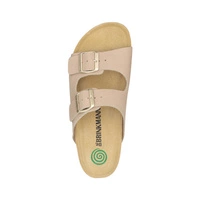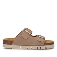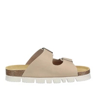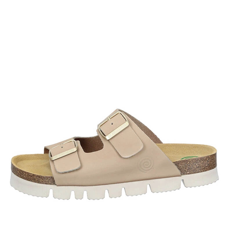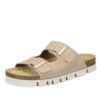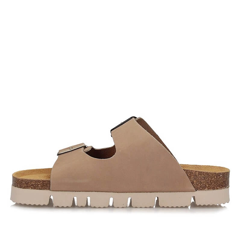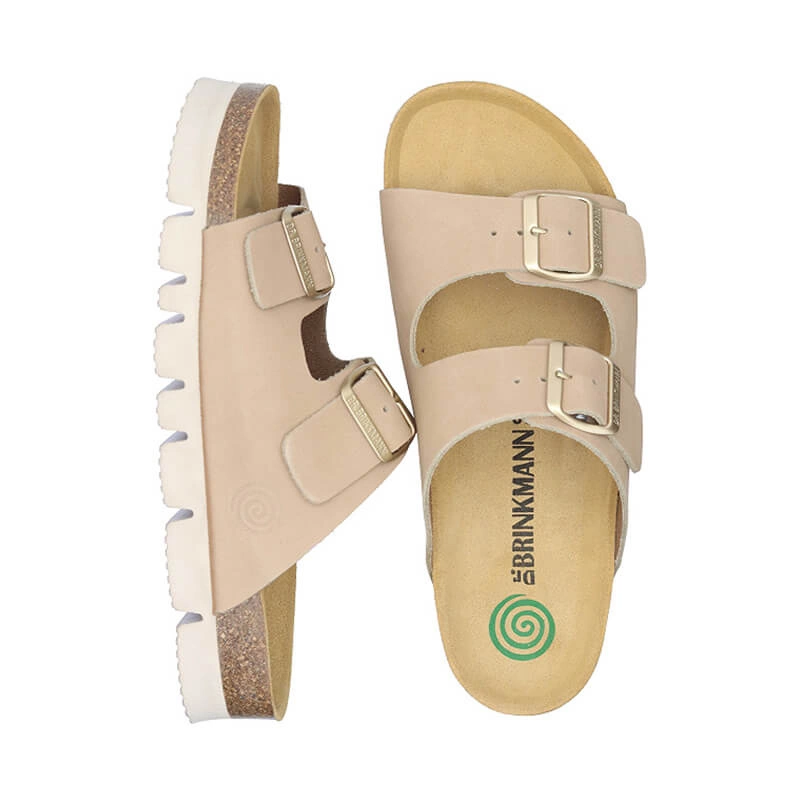 Oryginalny model klapek w kolorze beżowym przedstawia niemiecka marka Dr. Brinkmann. Prezentowany model wykonany został z wysokiej jakości skóry naturalnej zamszowej. Umieszczone paski na cholewce pozwalają na regulowanie tęgości klapek. Wkładka wykonana ze skóry naturalnej welurowej otula delikatnie stopę i gwarantować będzie odpowiedni mikroklimat dla stóp. W wkładce znajduję się również miejsce, które ma wspomagać podparcie łuku poprzecznego stopy i wpływać na naturalną oraz prawidłową pozycję ciała podczas stania. Zagłębienie pięty w tylnej części obuwia wspomaga naturalną postawę oraz równowagę całego naszego ciała. Do wyprodukowania wyściółki podeszwy użyto materiału korkowo-lateksowego co sprawia, że prezentowany model klapek jest bardzo lekki, elastyczny oraz komfortowy. Klapki marki Dr. Brinkmann będą idealnym uzupełnieniem wielu niezwykłych stylizacji.