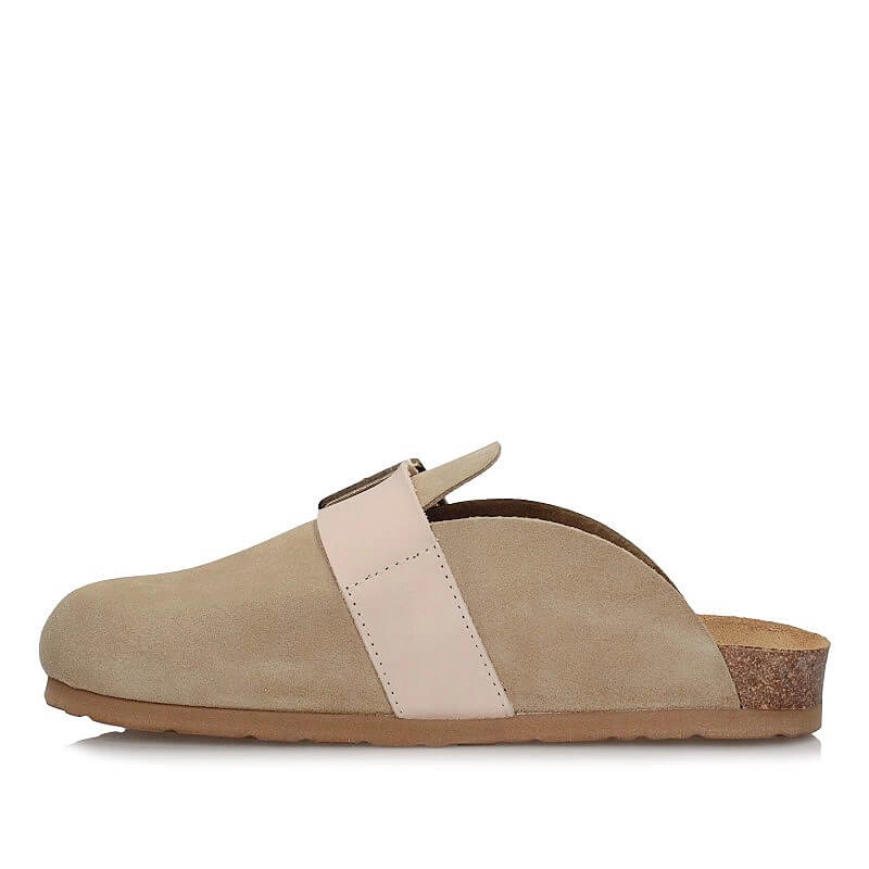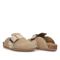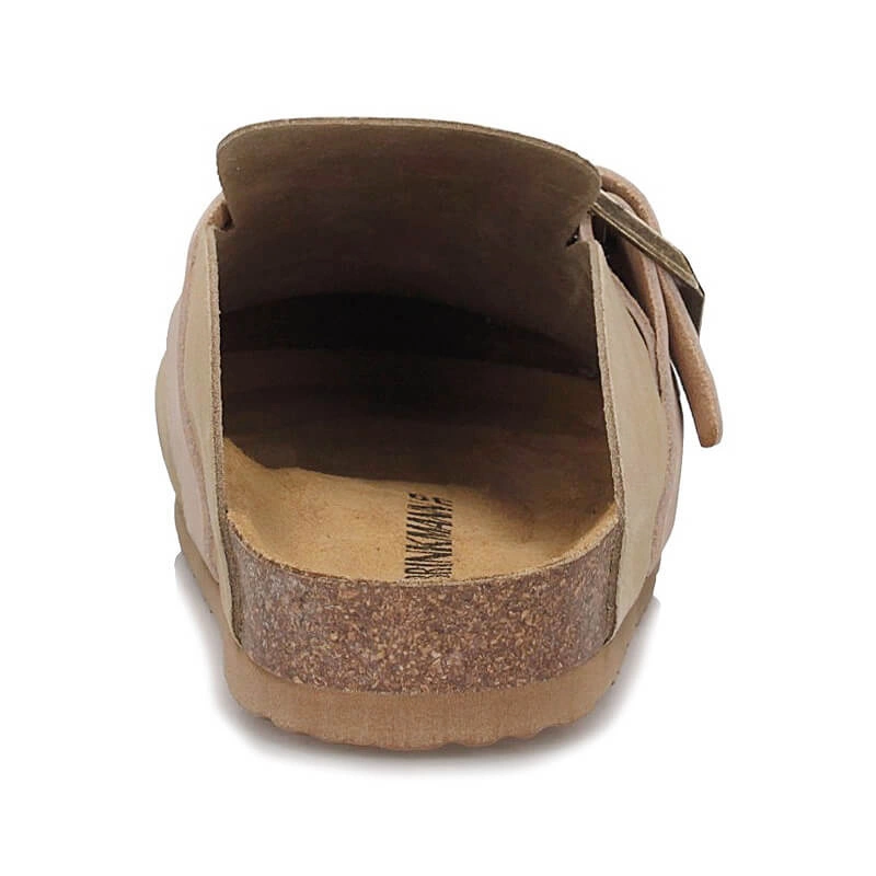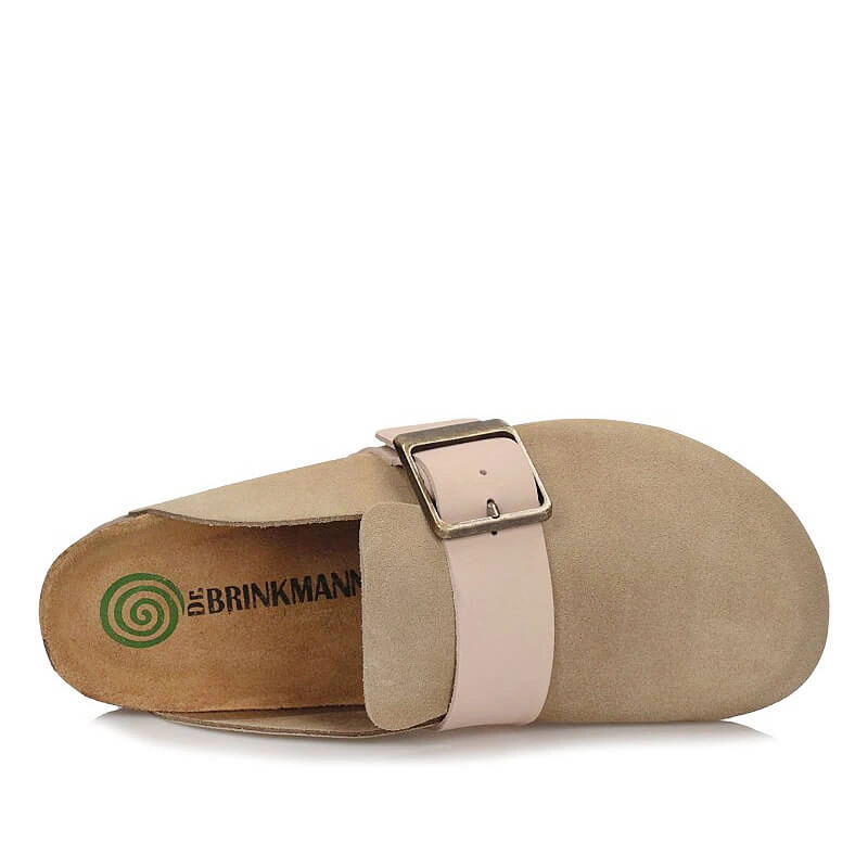 Dr. Brinkmann to niemiecka marka specjalizująca się w produkcji obuwia profilaktycznego, głównie kapci, klapek i sandałów. Do ich wykonania wykorzystywane są lekkie, profilowane spody oraz wysokiej jakości materiały na cholewki, dzięki temu obuwie Dr. Brinkmann zapewnia odpowiedni komfort dla stóp. Prezentowany model wykonany został z wysokiej jakości skóry naturalnej zamszowej w beżowym kolorze. Umieszczony pasek na cholewce pozwala na regulowanie tęgości klapek. Wkładka wykonana ze skóry naturalnej welurowej otula delikatnie stopę i gwarantować będzie odpowiedni mikroklimat dla stóp. W wkładce znajduję się również miejsce, które ma wspomagać podparcie łuku poprzecznego stopy i wpływać na naturalną oraz prawidłową pozycję ciała podczas stania. Zagłębienie pięty w tylnej części obuwia wspomaga naturalną postawę oraz równowagę całego naszego ciała. Do wyprodukowania wyściółki podeszwy użyto materiału korkowo-lateksowego co sprawia, że prezentowany model klapek jest bardzo lekki, elastyczny oraz komfortowy.
