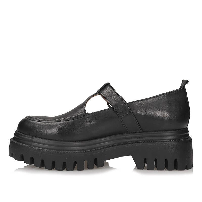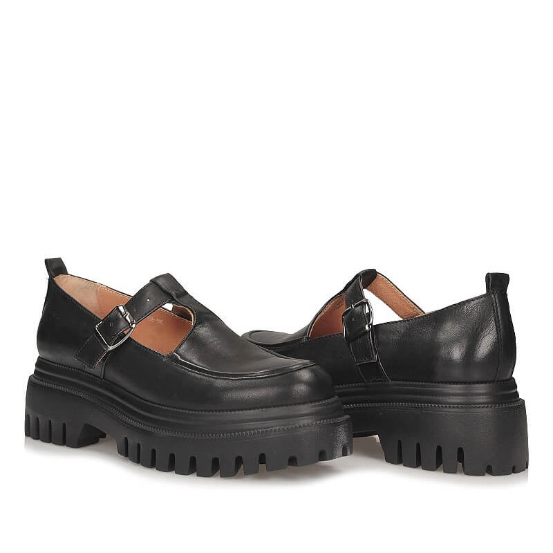 Półbuty marki Simen pochodzące z najnowszej kolekcji. Model wykonany ze skóry naturalnej licowej w czarnym kolorze. Obuwie postawione na grubej podeszwie na platformie. Buty są zapinane na pasek, dzięki któremu można dopasować obuwie do swojej stopy. Wnętrze butów wyłożone jest skórą naturalną. Nosek okrągły , lekko uniesiony ku górze. Półbuty świetnie dopasują się do wielu stylizacji.