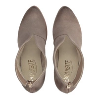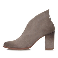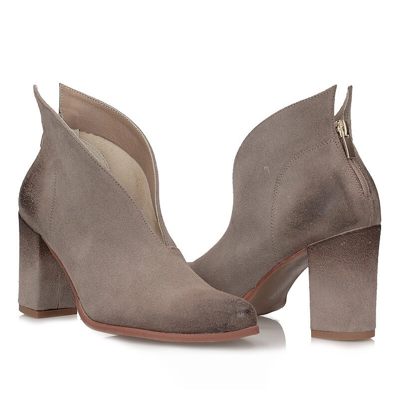Polska marka Exquisite prezentuje model wiosennego botka wykonanego z najwyższą starannością o każdy detal. Całość cholewki wykonana z naturalnej welurowej skóry w bardzo oryginalnym kolorze przełamanej szarości z beżem. Świetnie uzupełnienie całodziennych stylizacji jak i bardziej eleganckich. Pięknie skomponuje się z płaszczami, kurtkami, spodniami i sukienkami. Nosek delikatnie zaokrąglony i przyciemniony. Cholewka została zdobiona wycięciem w literę V. Zapinane z tyłu na zamek ze złotym suwakiem. Wysoki 8,5 cm, ale jednocześnie stabilny obcas to jeden z atutów obuwia. Idealnie wyważony dba o odpowiednią postawę, a jednocześnie podkreśla kobiece atuty. Wkładka wykonana z naturalnej skóry, która dba o higienę naszych stóp. Podeszwa z tworzywa gumowego.