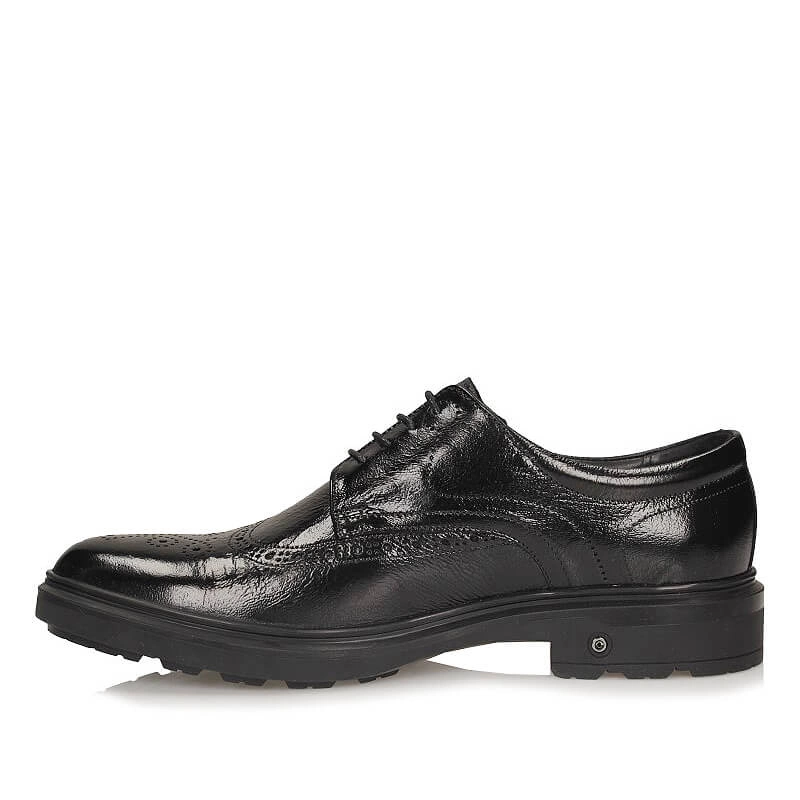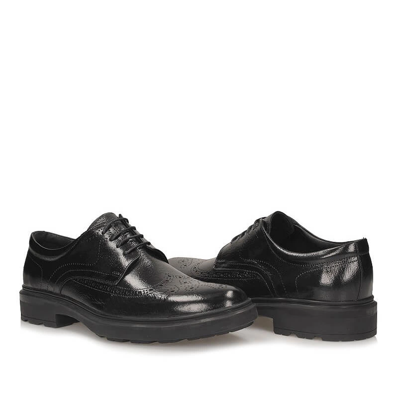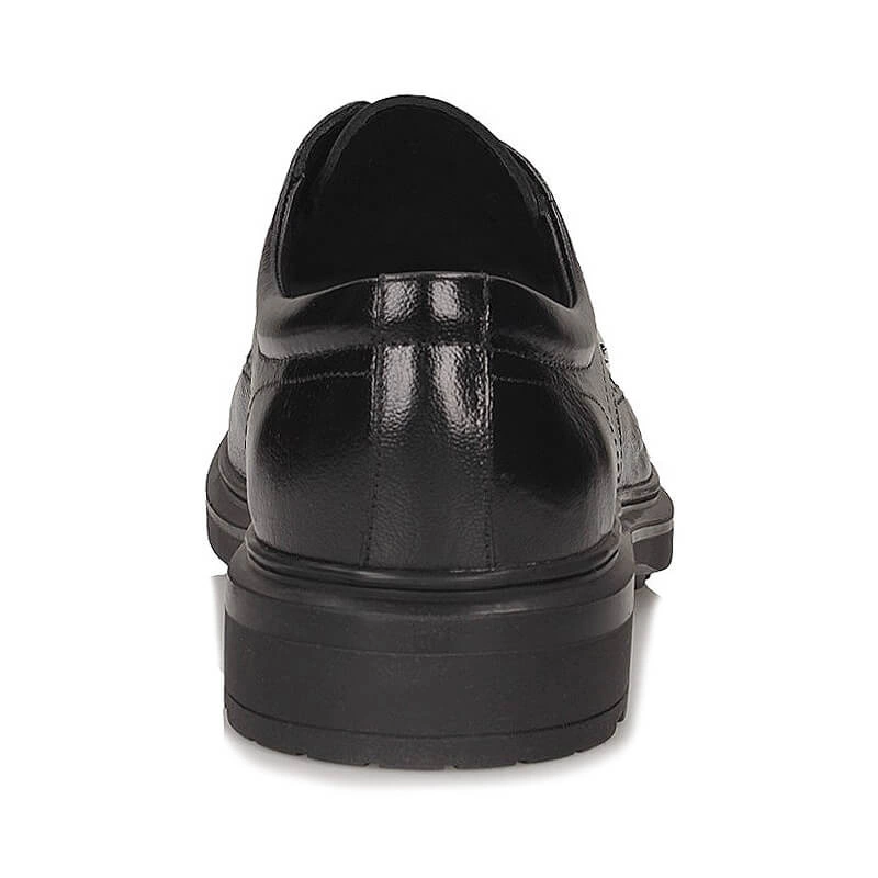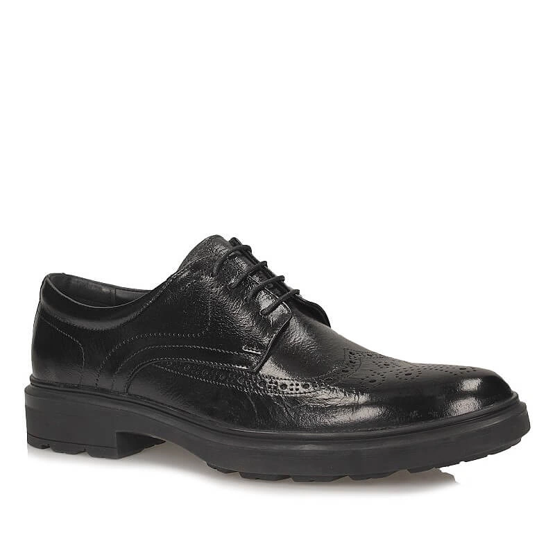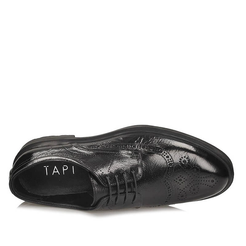 Półbuty polskiej marki Tapi pochodzące z najnowszej kolekcji. Eleganckie obuwie wykonane z wysokogatunkowej skóry naturalnej licowej, w klasycznym czarnym kolorze. Wnętrze obuwia wykonane zostało również ze skóry naturalnej, która zapewni komfort naszym stopom. Model jest sznurowany na cztery dziurki, co pozwoli na dopasowanie obuwia do tęgości stóp. Nosek jest zaokrąglony, lekko uniesiony ku górze. Podeszwa wykonana z wysokiej jakości tworzywa sztucznego odpornego na ścieranie. Na całym obuwiu są wzory.