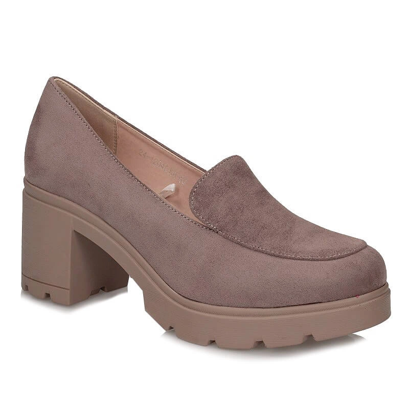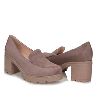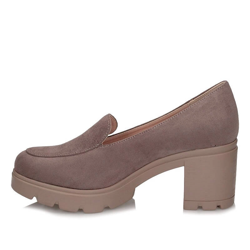 Półbuty prezentowane przez znaną markę Potocki pochodzące z najnowszej kolekcji. Obuwie wykonane z najwyższej jakości skóry ekologicznej zamszowej w bezowym odcieniu. Nosek szerszy, zaokrąglony, lekko uniesiony ku górze. Model wsuwany co pozwoli na szybkie zakładanie oraz zdejmowanie obuwia. Wysoki, ale szeroki i stabilny obcas o wysokości 6,5 cm. Wkładka wykonana z naturalnej skóry w jasnym kolorze. Podeszwa wykonana z wysokogatunkowego tworzywa, odpornego na ścieranie. Fason świetnie sprawdzi się w całodziennym użytkowaniu.