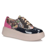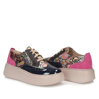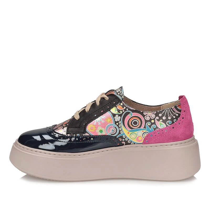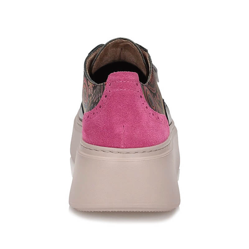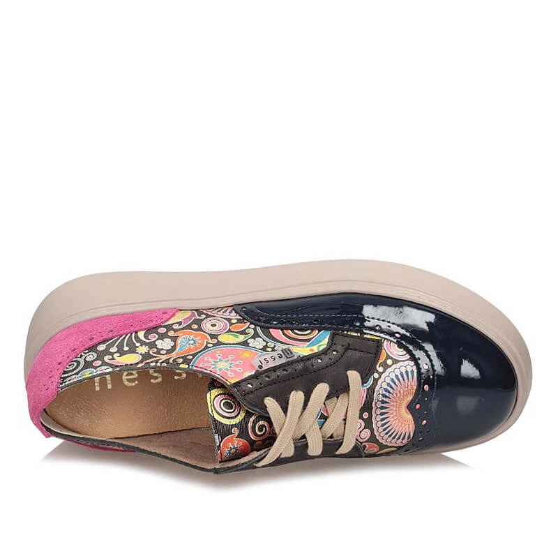 Ciekawy i niecodzienny wzór obuwia damskiego prezentuje nam marka Nesi. Sneakresy wykonane z naturalnej skóry: lakierowanej, zamszowej i licowej. Uwagę warto zwrócić na kolorową cholewkę, która świetnie wpisuje się w wiosenno-letnie trendy. Kolorowe zdobienia rozjaśniają całość i nadają ""lekkości stylu". Wnętrze wyściełane naturalną skórą, boki wzmocnione tkaniną. Idealne dopasowanie tęgości do stopy zapewnia sznurowanie, dzięki czemu obuwie pozostaje stabilne na stopie. Całość osadzona na platformie o grubości 4,5 cm  -  świetna amortyzacja od podłoża. Podeszwa wykonana z tworzywa sztucznego. Must heve dla miłośniczek modowych perełek.