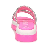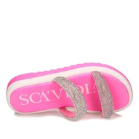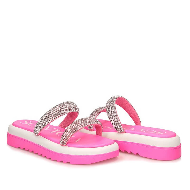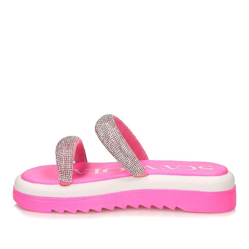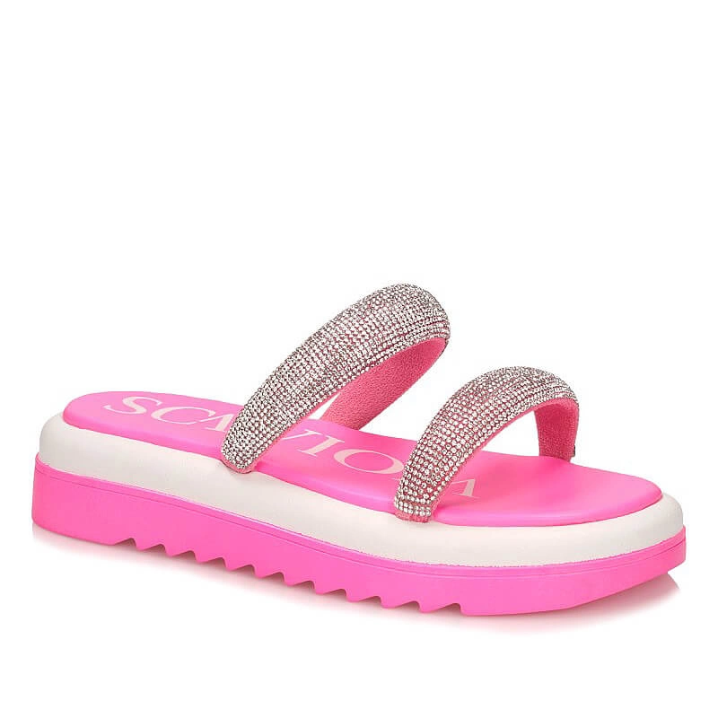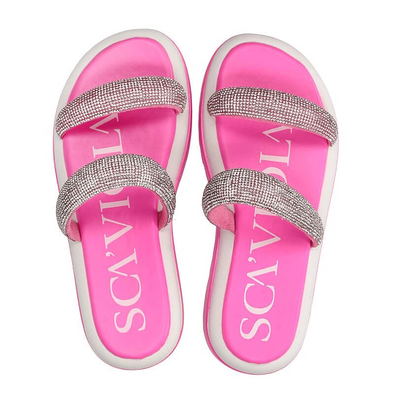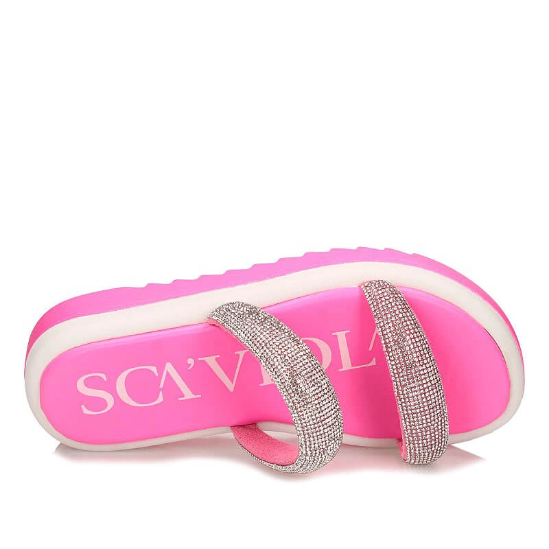 Znana i lubiana przez klientów marka Sca'viola po raz kolejny przedstawia klapki z najnowszej kolekcji wiosenno-letniej. Cholewka wykonana została z wysokojakościowej tkaniny w odcieniu różowym, która zdobiona jest srebrnymi cyrkoniami. Wnętrze wykonano ze skóry ekologicznej, a wkładkę z wysokogatunkowego materiału tekstylnego w pięknym neonowym odcieniu różowym. Klapki są wsuwane, co umożliwia szybkie założenie jak i zdjęcie ich. Całość umieszczona na 4,5 cm platformie wykonanej z tworzywa sztucznego. Powyższy model sprawdzi się świetnie przy letnich, plażowych stylizacjach.