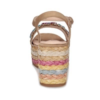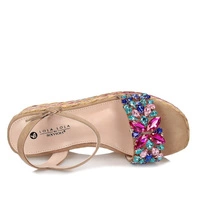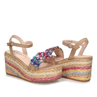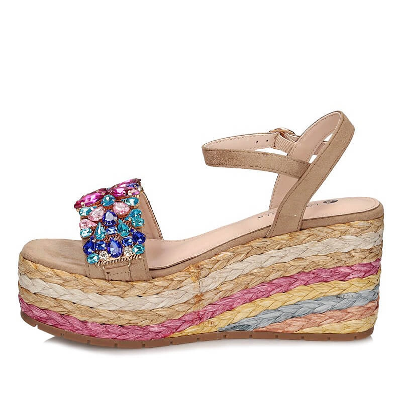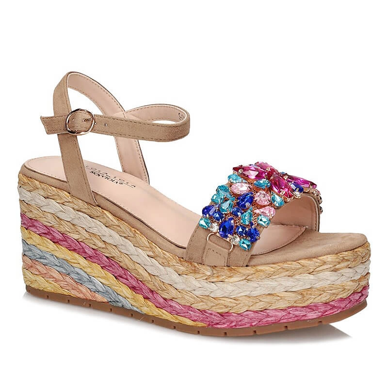 Sandały znanej i cenionej marki Sca'viola pochodzące z najnowszej kolekcji wiosenno-letniej. Sandały idealnie wpisują się w najnowsze modowe trendy. Kolorowe ozdoby sprawiają, że model świetnie uzupełni wiele stylizacji. Na przodzie szerszy pasek ozdobiony kolorowymi kamieniami. Zapiane na sprzączkę , która gwarantuje stabilność podczas użytkowania. Wnętrze wykonane w połączeniu skóry ekologicznej z naturalną. Podeszwa pogrubiona, świetnie amortyzuje od powierzchni ,ozdobiona kolorowym ratanem. Z przodu platforma o grubości 4 cm, z tyłu klin o wysokości 9 cm. Podeszwa wykonana z tworzywa.